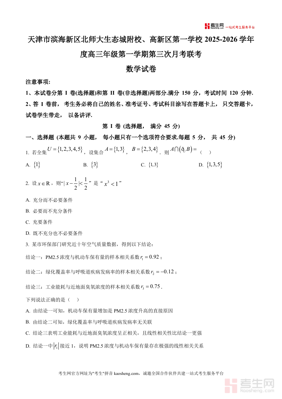 《精品解析:天津市滨海新区北京师范大学天津生态城附属学校、高新区第一学校2025-2026学年高三上学期第三次月考联考数学试卷(原卷版)》是一份针对高三年级数学学科阶段性检测的优质备考资料,聚焦天津市滨海新区区域联考的命题趋势与核心考点。该试卷涵盖选择题(9题)、填空题(6题)、解答题(5题)三大题型共20道题目,覆盖集合与逻辑、函数性质、三角函数、立体几何、解析几何、数列、概率统计及导数应用等核心知识模块,其特色亮点在于严格遵循天津高考数学命题框架,题型设置与分值分布完全匹配高考标准,并融入区域教学中的高频易错点,能有效帮助学生精准把握本地联考的考查重点。