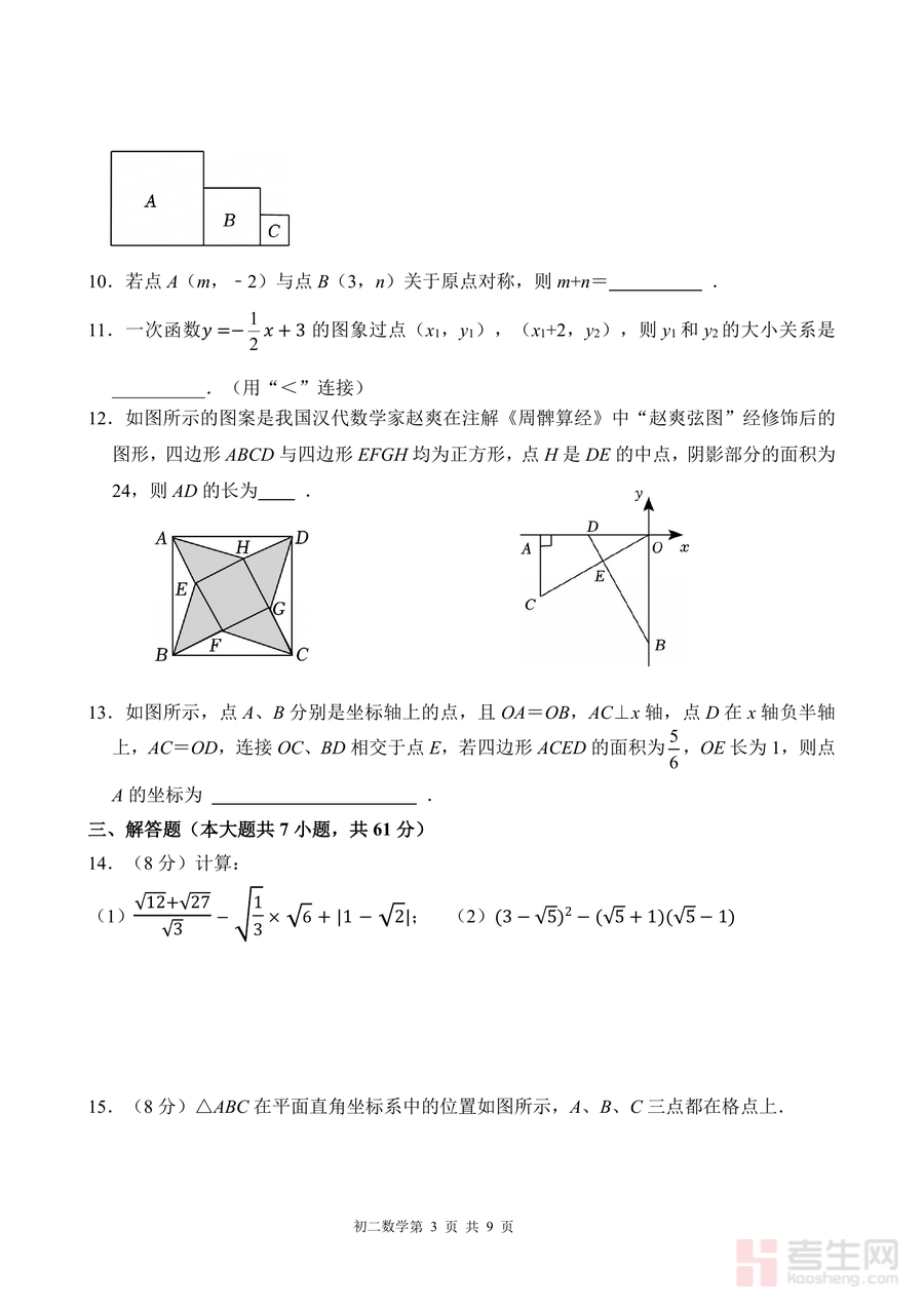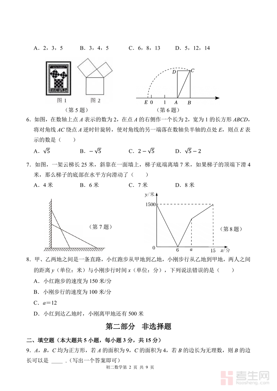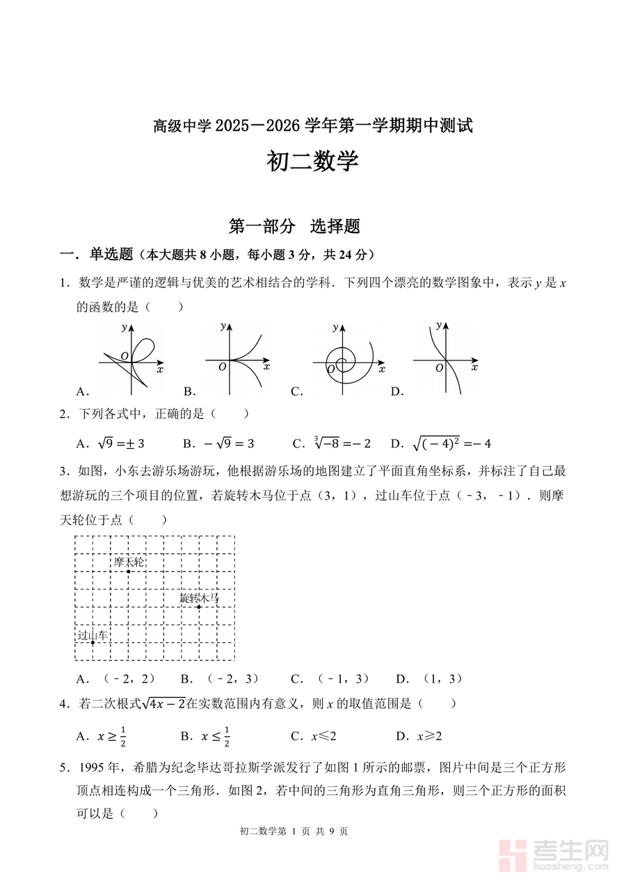 《广东省深圳高级中学2025-2026学年八年级上学期期中数学试题.pdf》是一份针对深圳高级中学八年级学生的期中数学真题资料,涵盖单选题(8小题)、填空题(5小题)、解答题(7小题)三大题型共9页内容。试题覆盖函数图像判断、二次根式有意义条件、勾股定理应用、平面直角坐标系操作等八年级上册核心知识点;特色亮点在于融入创新题型,如"和谐组合"定义探究题考查数学概念理解与应用能力,极径斜率坐标拓展题结合几何与代数知识,全面检验学生的综合思维水平,同时包含赵爽弦图相关题型,强化传统数学文化与现代考点结合。