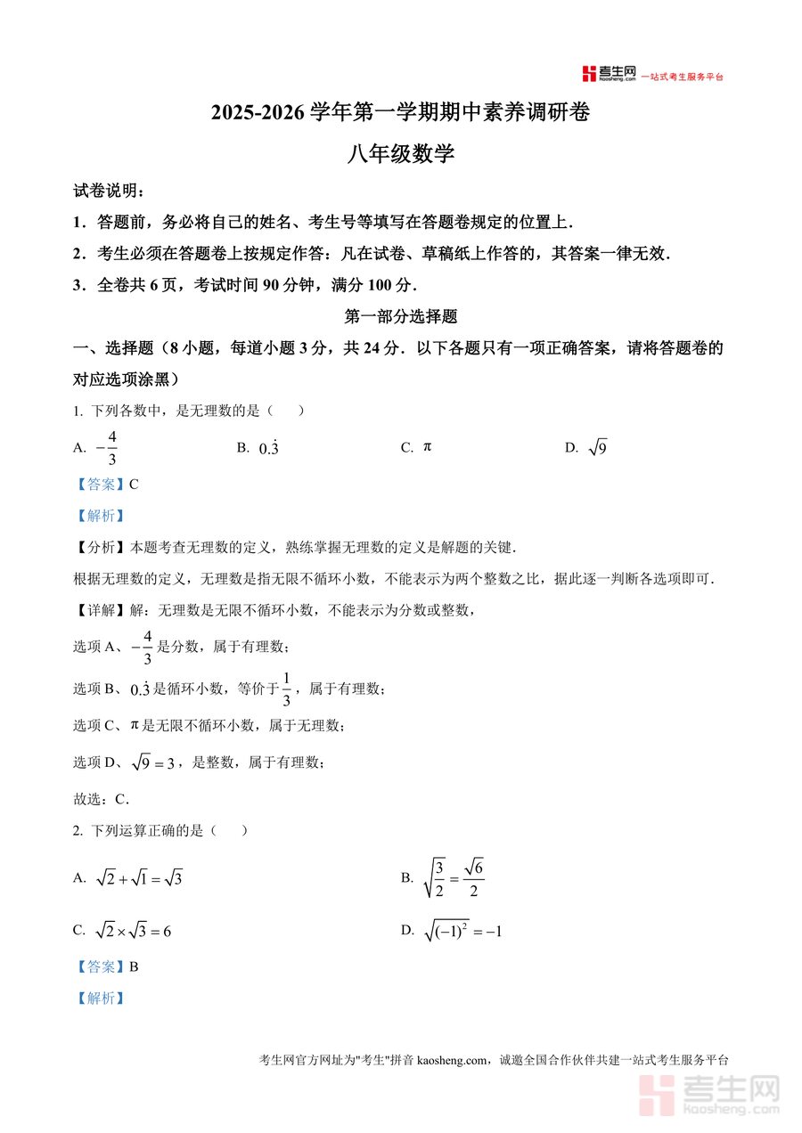 《精品解析:广东省深圳市宝安区21校联考2025-2026学年八年级上学期期中数学试题(解析版).docx》是一份聚焦宝安区八年级期中联考数学科目的精准备考资料。该资料包含选择题(8道)、填空题(5道)及解答题(7道)三大题型,每道试题均配备详尽解析,涵盖考点溯源、解题逻辑推导及规范步骤示范,如无理数定义判断中对无限不循环小数本质特征解读,二次根式运算中对运算法则严谨应用说明,坐标问题中平面直角坐标系构建与点位确定方法直观演示等,全面覆盖该学段核心知识点与典型题型。