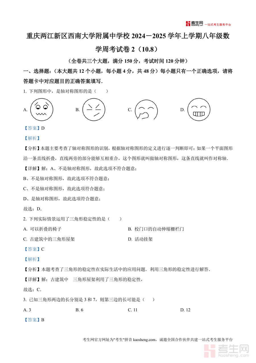 《精品解析:重庆两江新区西南大学附属中学校2024--2025学年上学期八年级数学周考试卷2(108)(解析版)docx》是一份针对该校八年级上学期数学周考的精准化真题解析类备考资料。文件包含完整试卷原题(全卷三大题共150分,涵盖选择题、填空题及解答题三大题型)与逐题详细解析,内容覆盖轴对称图形识别、三角形稳定性应用、全等三角形判定、因式分解等八年级上册核心知识点。其特色亮点在于解析部分不仅给出标准答案及步骤,还附加考点分析与解题思路拓展——如选择题中对轴对称图形定义的深度解读、几何题中折叠性质与平行线结合技巧总结——帮助学生从本质上掌握知识点,而非机械记忆答案。