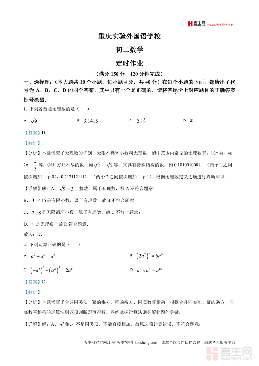 《精品解析:重庆实验外国语学校2024-2025学年八年级上学期第一次月考数学试题(解析版)》是一份针对该校八年级学生首次月考设计的精准化数学备考资料。资料包含完整真题及逐题深度解析,覆盖选择题(10小题)、填空题(10小题)、解答题(7小题)三大题型,总分150分,考试时长120分钟,完全贴合该校月考题型结构与难度梯度。解析部分突出考点定位(如无理数识别、幂运算、因式分解等核心知识点)、解题思路拆解(如几何题辅助线构造、代数题公式应用)及易错点警示,每道题均标注考点类型及难度层级,帮助学生清晰掌握题目背后的知识逻辑与应试技巧。