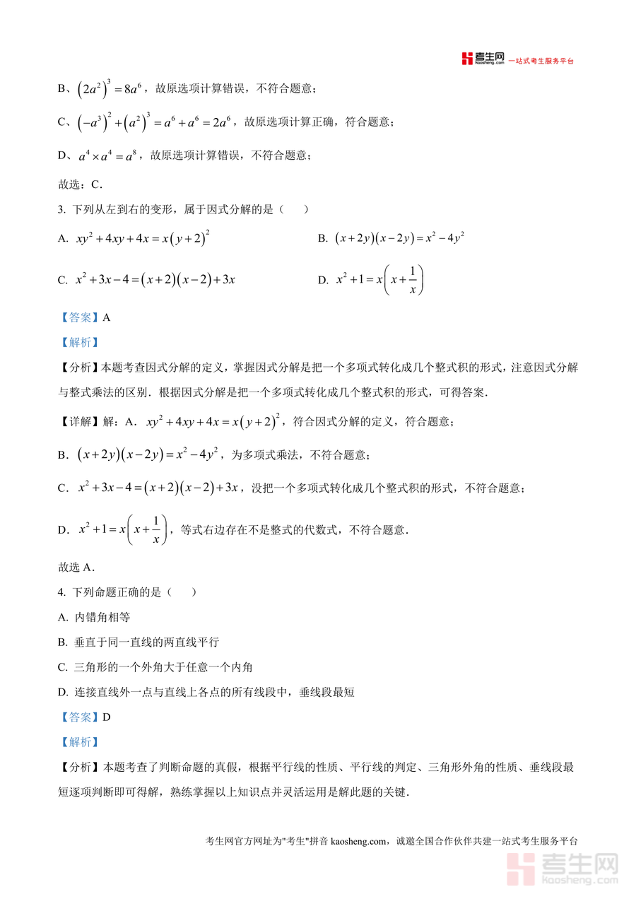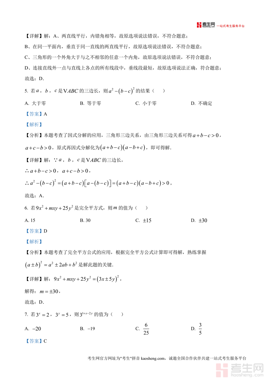 该资料核心用途在于助力学生高效备考,适用于课后针对性复习(对照解析巩固薄弱知识点)、考前冲刺模拟(按考试时长完成真题后核对解析)、自主学习后的错题订正场景。其用户价值体现在通过真题解析精准对接该校教学重点,提升应试能力,例如针对完全平方式参数求解、几何全等三角形判定等易错题型给出专项指导;代数题中的幂运算与因式分解技巧讲解,强化计算准确性。相比普通练习册,该资料备考优势在于真题来源权威,解析贴合该校命题风格,避免学生盲目刷题,有效提升复习效率。