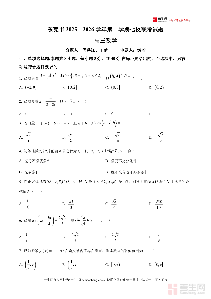 《精品解析:广东省东莞市2025-2026学年高三上学期12月7校联考数学试题(原卷版)》是一份针对高三学生的区域联考数学真题资料,由周碧江、王倩命题及游莉审题,涵盖单项选择(8题)、多项选择(3题)、填空(3题)及解答题(5题)四大题型,全面覆盖集合与复数、向量与数列、立体几何与解析几何、概率统计等高考核心知识点。该资料以七校联合命题为背景,题型设置贴合高考数学命题趋势,题目梯度合理——从基础概念考查(如集合运算、复数模计算)到综合能力应用(如函数零点问题、双曲线离心率推导),能有效反映区域内高三学生知识掌握水平,是兼具权威性与实用性的备考资料。