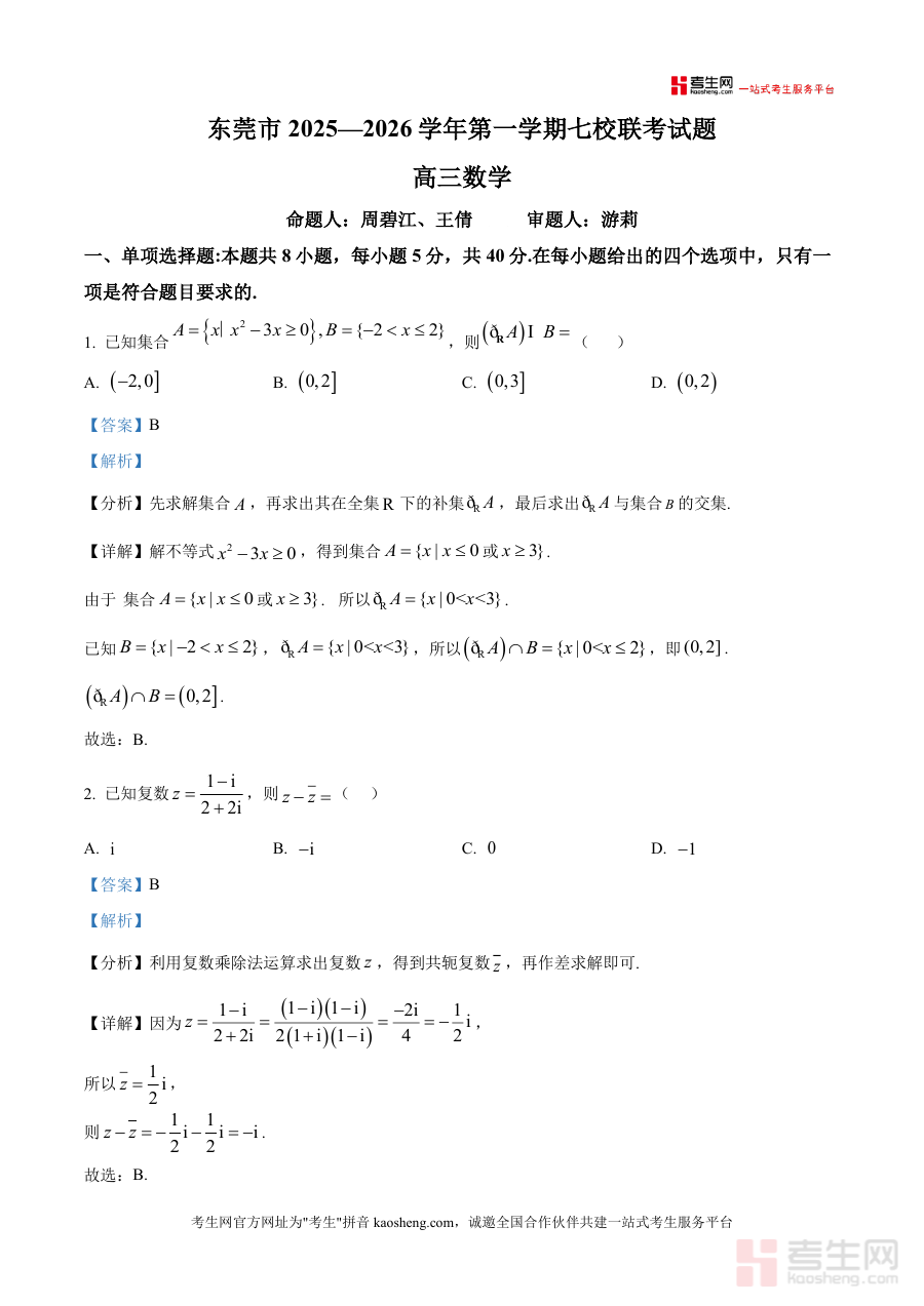 《精品解析:广东省东莞市2025-2026学年高三上学期12月7校联考数学试题(解析版)》是一份聚焦高三数学联考实战需求、融合权威命题思路与深度解题策略的真题解析备考资料。该资料覆盖集合与逻辑、复数运算、向量应用等高中数学核心模块,每份试题配备“分析+详解”双栏结构——“分析”拆解命题意图与考点关联,“详解”呈现规范答题步骤与关键公式应用;依托东莞七校联考区域权威性,精准反映当地高三数学教学重点与命题趋势,助力学生把握联考难度梯度与题型分布特征。