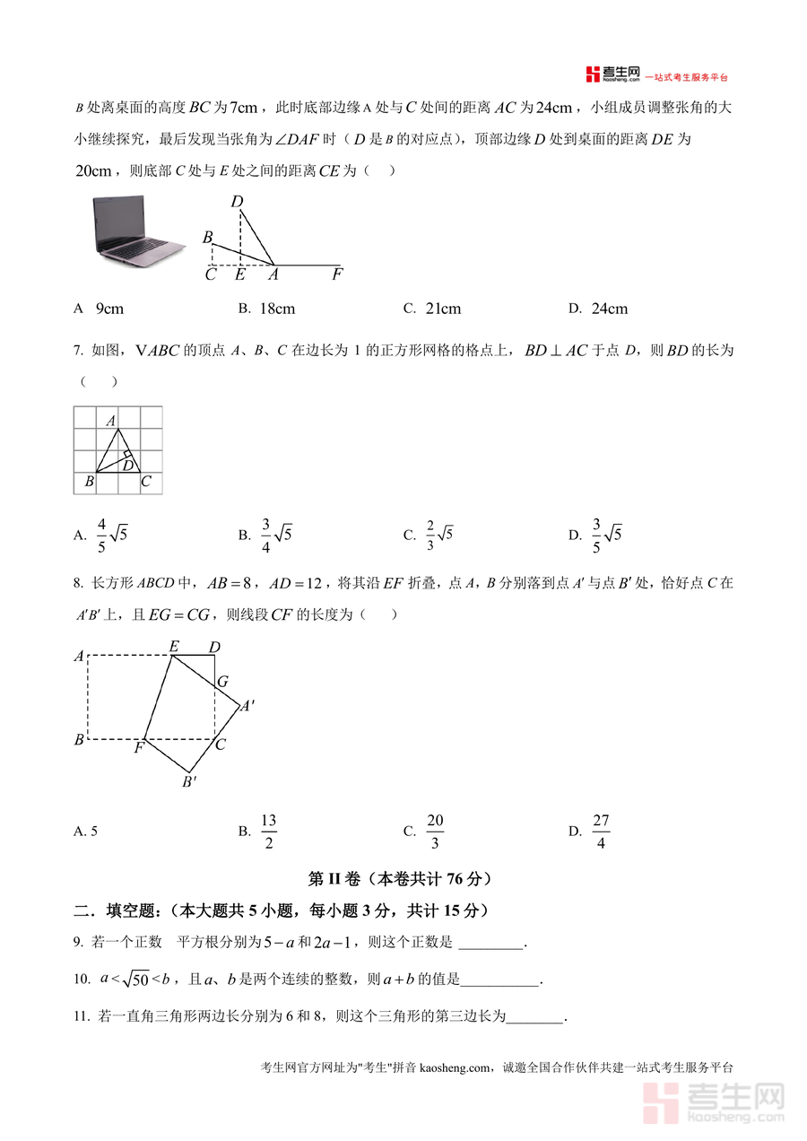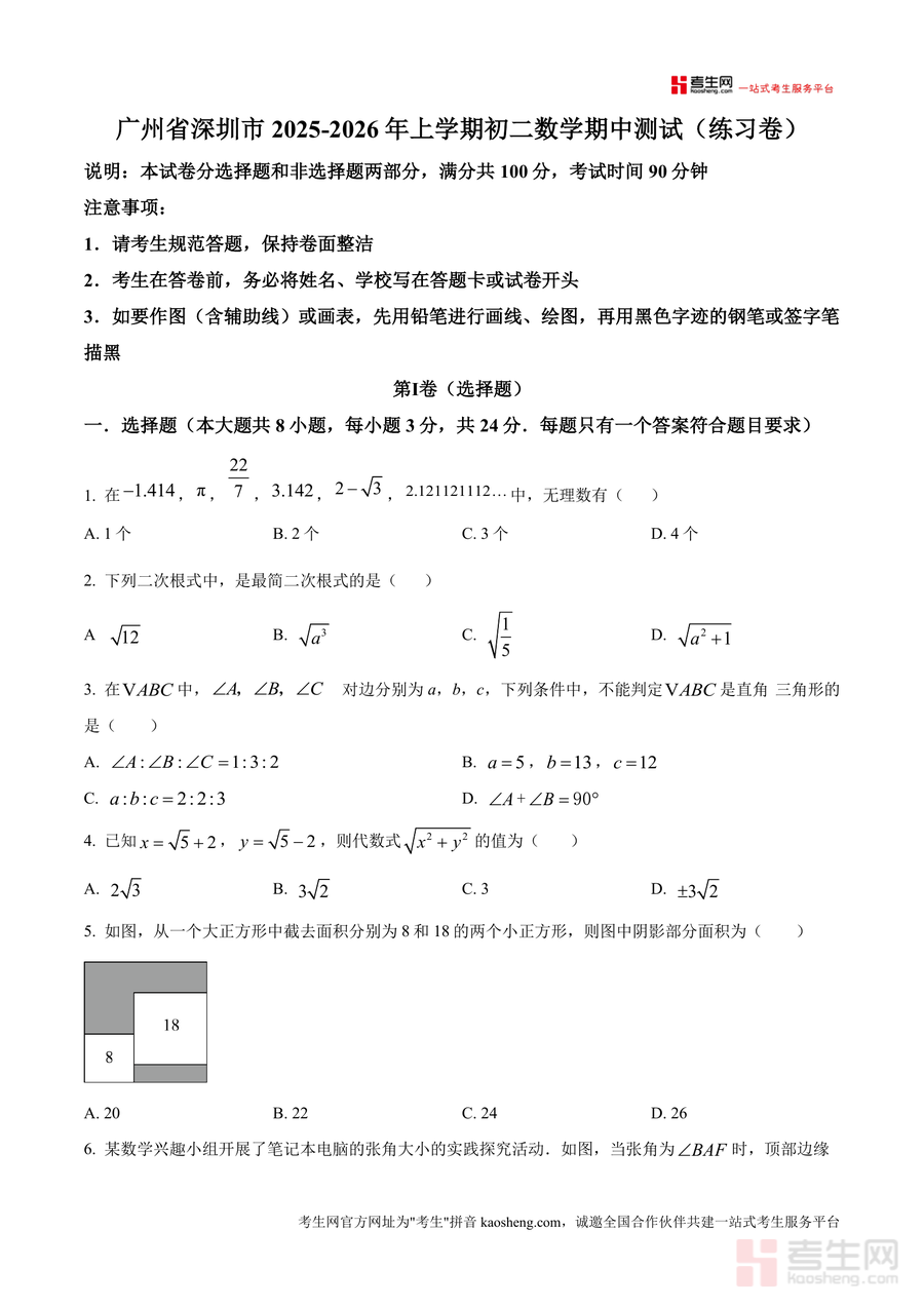 《精品解析:广东省深圳市2025-2026学年上学期八年级数学期中测试(练习卷)-提高版(原卷版)》是一份针对深圳市八年级学生期中备考的专业数学练习资料,核心定位为提升学生应试能力与知识应用水平。该资料严格遵循深圳本地教学大纲与期中命题趋势设计,包含选择题(8小题)、填空题(5小题)及解答题(7小题)三大题型,覆盖无理数识别、二次根式化简、勾股定理应用等上册核心知识点;特色亮点在于采用提高版难度设置,并注重逻辑思维与综合解题能力训练;原卷版提供标准答题空间,便于学生模拟真实考试场景进行实战演练。