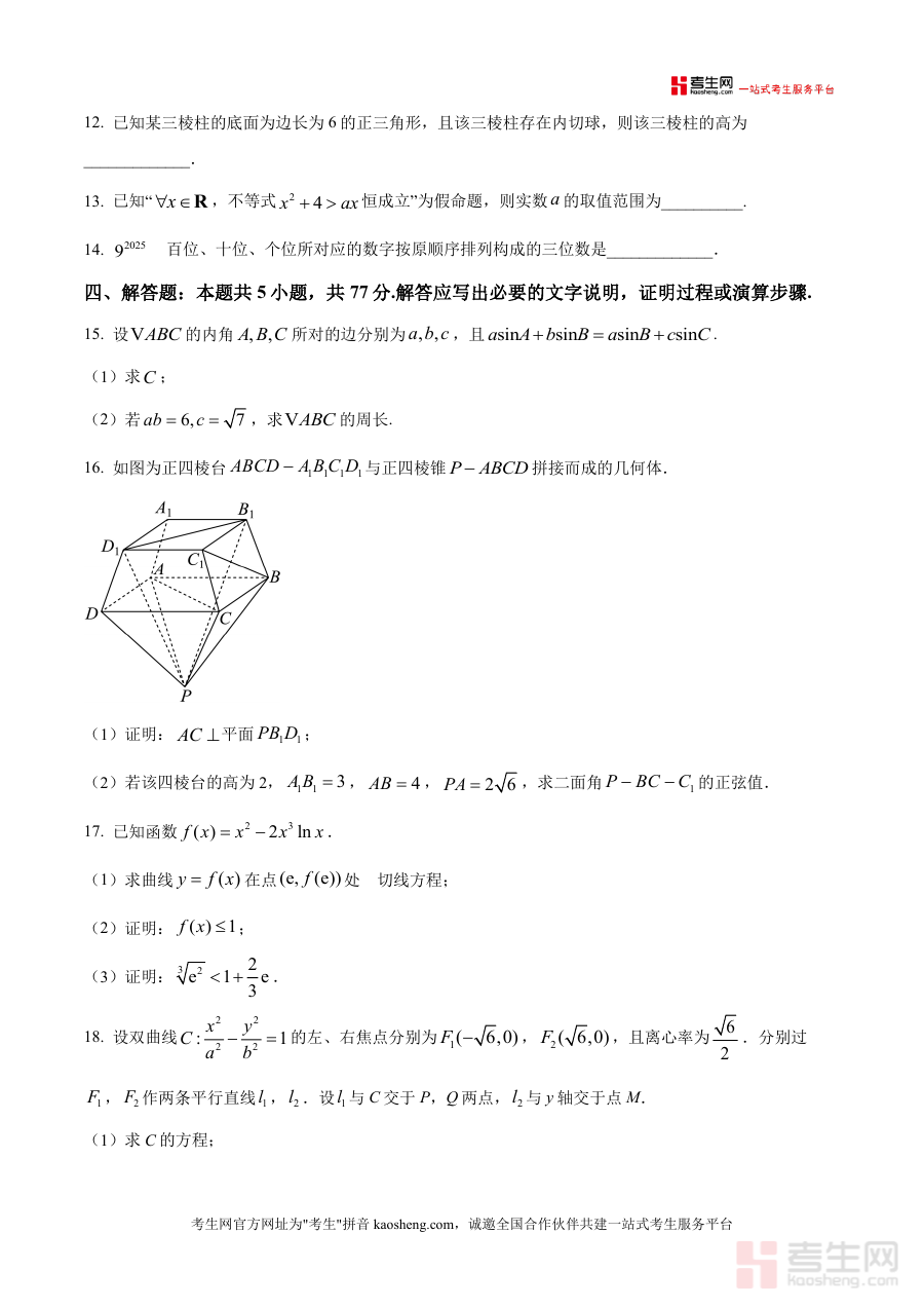 该资料核心用途为帮助学生熟悉高三阶段联考题型设置与难度水平,精准检测阶段性学习成果;使用场景包括课堂限时模拟考试、课后自主刷题训练及教师教学参考等。用户通过练习可掌握高频考点解题思路(如函数同一概念判断、立体几何二面角求解等),识别自身知识薄弱环节;其备考优势在于依托多校联考原卷的真实性与典型性,能有效提升学生应试能力,让学生提前适应高考题型结构,明确后续复习重点方向,为高效备考提供有力支撑。