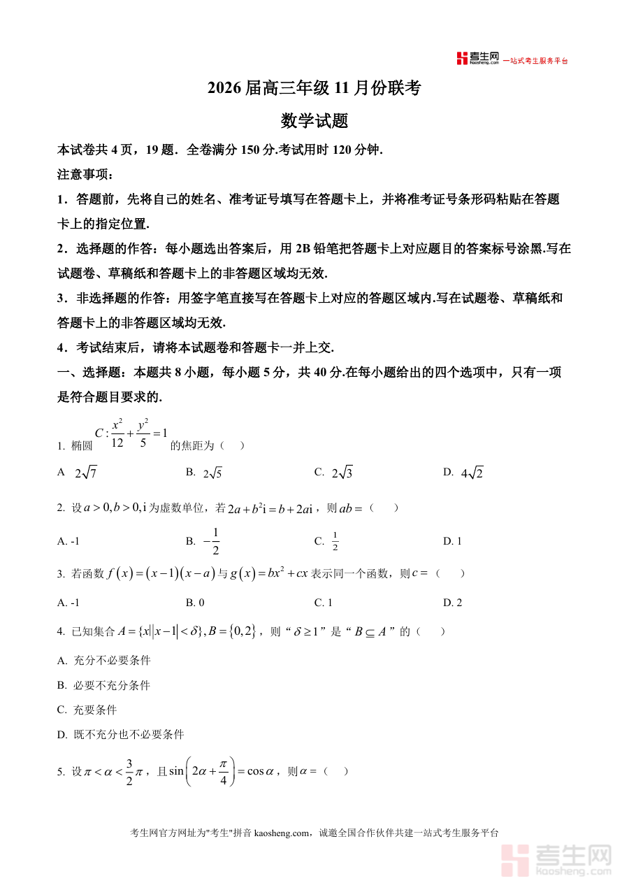 《精品解析:广东省多校2026届高三上学期11月联考数学试卷(原卷版)》是一份针对广东省2026届高三学生数学备考需求的高质量联考原卷资料,完整呈现本次联考数学试卷全部内容,包含试卷结构说明、答题注意事项及各类题型设置。试卷共4页19题,满分150分,考试用时120分钟;题型涵盖8道单选题、3道多选题、3道填空题及5道解答题,覆盖椭圆焦距计算、虚数运算性质、函数同一性判断、集合逻辑关系、数列求和、立体几何内切球、双曲线方程等核心知识点,充分体现联考对高考重点内容的针对性考查,是反映区域备考趋势的权威备考资料。