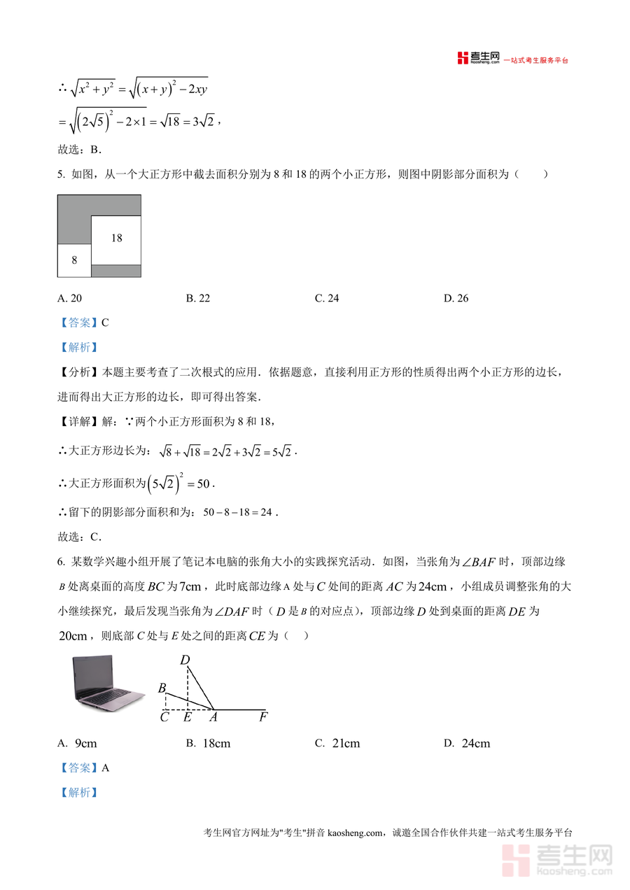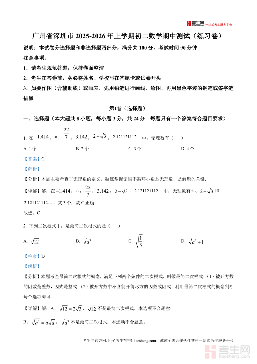 《精品解析:广东省深圳市2025-2026学年上学期八年级数学期中测试(练习卷)-提高版(解析版).docx》是一份针对深圳地区八年级学生期中数学备考设计 的高质量真题解析类备考资料。该资料严格遵循深圳本地期中测试题型结构与考纲要求,包含选择题(8小题)、填空题(5小题)及解答题(7小题)三大板块,覆盖无理数定义、最简二次根式判定、勾股定理应用等核心考点;每道试题均配备详尽解析,涵盖考点分析、解题思路推导及易错点提示,帮助学生精准把握知识本质与解题逻辑。