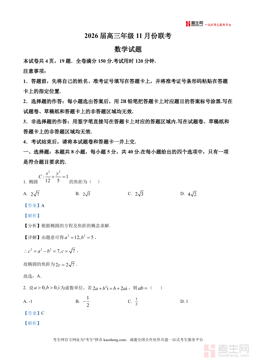 《精品解析:广东省多校2026届高三上学期11月联考数学试卷(解析版).docx》是一份针对广东省高三学生数学备考需求的专业真题解析资料,涵盖试卷原题及全题型详细解答。资料包含选择题、填空题、解答题等完整题型,每个题目均配备清晰分析思路与步骤详解,如椭圆焦距计算、虚数运算性质应用、函数相同条件判定等基础考点,以及数列递推求和、空间几何体二面角求解、导数证明不等式等综合题型,通过拆解考点逻辑与解题方法,帮助使用者深入理解数学知识的应用场景。