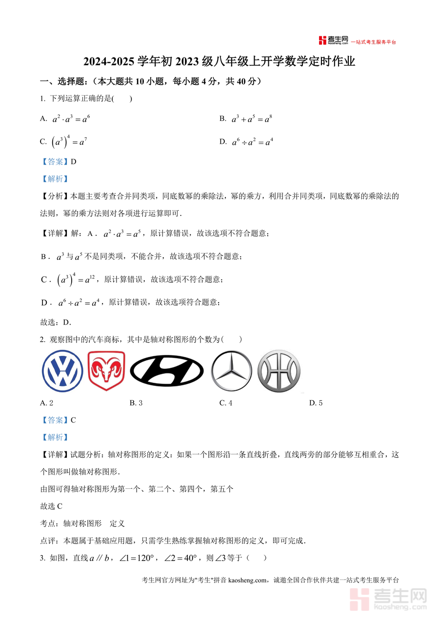 《精品解析:重庆市南岸区广益中学2024-2025学年八年级上学期入学测试数学试题(解析版)》是一份针对广益中学八年级新生入学测试的专业数学备考资料。该资料包含完整试题及详细解析,试题结构覆盖选择题(10小题)、填空题(8小题)、解答题(8小题),解析部分针对每道题目详细拆解考点(如合并同类项、轴对称图形、平行线性质等),并提供清晰解题步骤与思路点拨,特色在于结合该校教学实际与学生认知水平,精准匹配入学测试的考查方向,融入真题解析核心要素,助力学生把握校考命题规律。