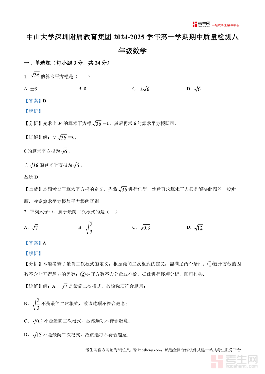《精品解析:广东省深圳市中山大学附属实验学校2025-2026学年上学期八年级期中考试数学试卷(解析版).docx》是一份聚焦该校八年级期中数学考试核心考点 的专业真题解析资料,完整呈现单选题(8道)、填空题(5道)及解答题(6道)全题型结构,每道题均配备精准答案与分层解析。资料融合"型全等"模型应用、勾股定理实际场景解题、二次根式运算规范等内容,以真题解析为载体,助力学生深化考点理解,提升应试能力。