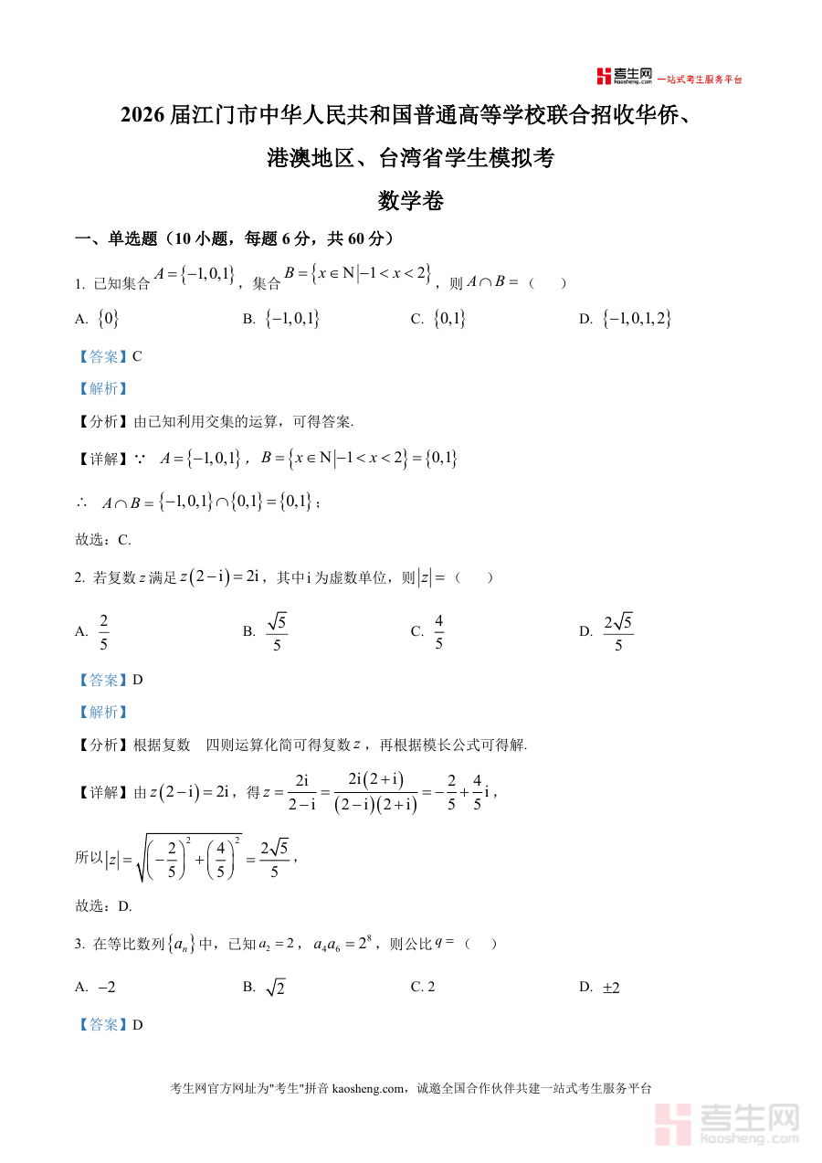 《精品解析:广东省江门市2026届高三港澳台联考一模数学试题(解析版).docx》是一份针对港澳台联考高三学生数学备考 的专业真题解析资料。该资料覆盖单选题(10题)、填空题(5题)及解答题(4题)全题型结构,每个题目均配备精准答案及详尽解析,解析包含"分析""详解""点睛"模块:如集合交集运算通过元素范围确定步骤、复数模长计算结合四则运算化简逻辑,圆锥外接球问题依托轴截面几何关系推导半径公式,函数反函数求解强调值域与定义域转换要点等。其特色亮点在于严格贴合港澳台联考数学考纲要求,突出考点关联性与解题方法普适性,助力学生构建清晰知识应用框架。