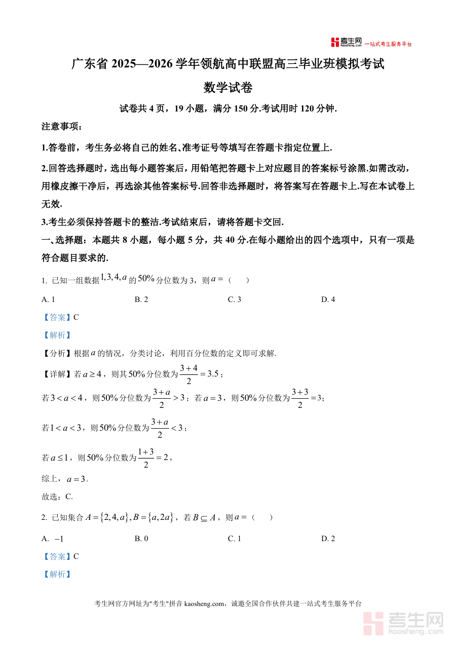 本资料适用于广东省高三在读学生、高中数学教师及高考备考辅导人员。作为高三数学备考 的必备工具,它不仅能帮助学生巩固基础知识、培养逻辑思维与解题能力,还可为教师提供优质教学案例参考;其不可替代性在于联盟命题特色与详细解析相结合 的双重优势,长期价值体现在助力学生构建系统的数学知识体系,提升综合解题能力,为高考取得优异成绩提供有力支持。