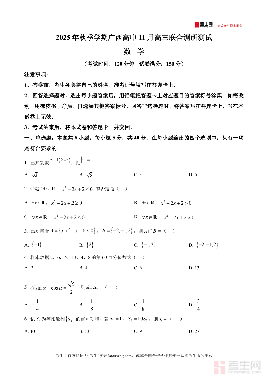 本文件适用于广西壮族自治区高三年级学生、高中数学教师及高考备考指导人员。作为本次联合调研测试的原卷资料,它具有不可替代性——不仅能为学生提供真实的测试体验,还能帮助教师了解区域内学生学习状况,调整教学策略。从长期价值来看,该试题可作为高三数学复习的重要参考素材之一,助力学生在高考备考过程中巩固基础、突破难点,为最终冲刺高考奠定坚实基础。