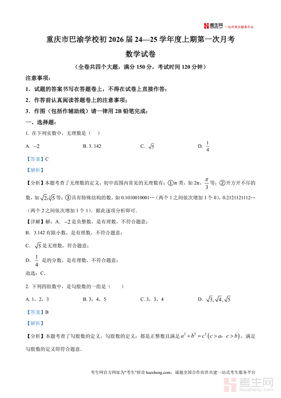 《精品解析:重庆市巴渝学校2024-2025学年八年级上学期第一次定时作业数学试题(解析版).docx》是一份针对该校初2026届八年级上学期首次定时作业数学考试设计专业解析资料。资料涵盖全卷四大题(选择、填空、解答等题型),包含从基础概念到综合应用各层级试题的详细解析,每个题目均配有考点分析、步骤化详解及易错点提示——如无理数判断题明确初中常见无理数类型,勾股定理应用题结合《九章算术》"折竹抵地"典故展开思路推导。其特色在于解析紧密贴合该校教学进度与命题风格,兼顾知识点巩固与解题方法迁移,为学生提供全面试题解读支撑。
