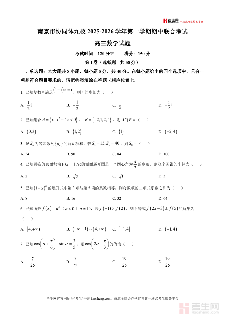 《精品解析:江苏省南京市协同体九校2025-2026学年高三上学期期中联考数学试题(原卷版)》是一份聚焦江苏省南京市高三期中复习阶段的权威真题资料,核心定位为区域协同命题下的标准化测试资源。主要内容覆盖复数运算、集合关系、等差数列求和、圆锥表面积与侧面展开图计算、二项式系数分析、函数单调性与零点问题、三角函数图象性质、概率统计应用、立体几何证明与空间夹角求解、数列通项推导与求和等高三数学核心知识模块;题型结构严格匹配江苏高考命题规范(单选题8道40分、多选题3道18分、填空题3道15分、解答题5道77分),特色亮点在于整合九校教学资源与区域备考重点,题目设置兼顾基础巩固与能力选拔,能精准折射当前高三数学教学的核心导向与联考命题趋势。