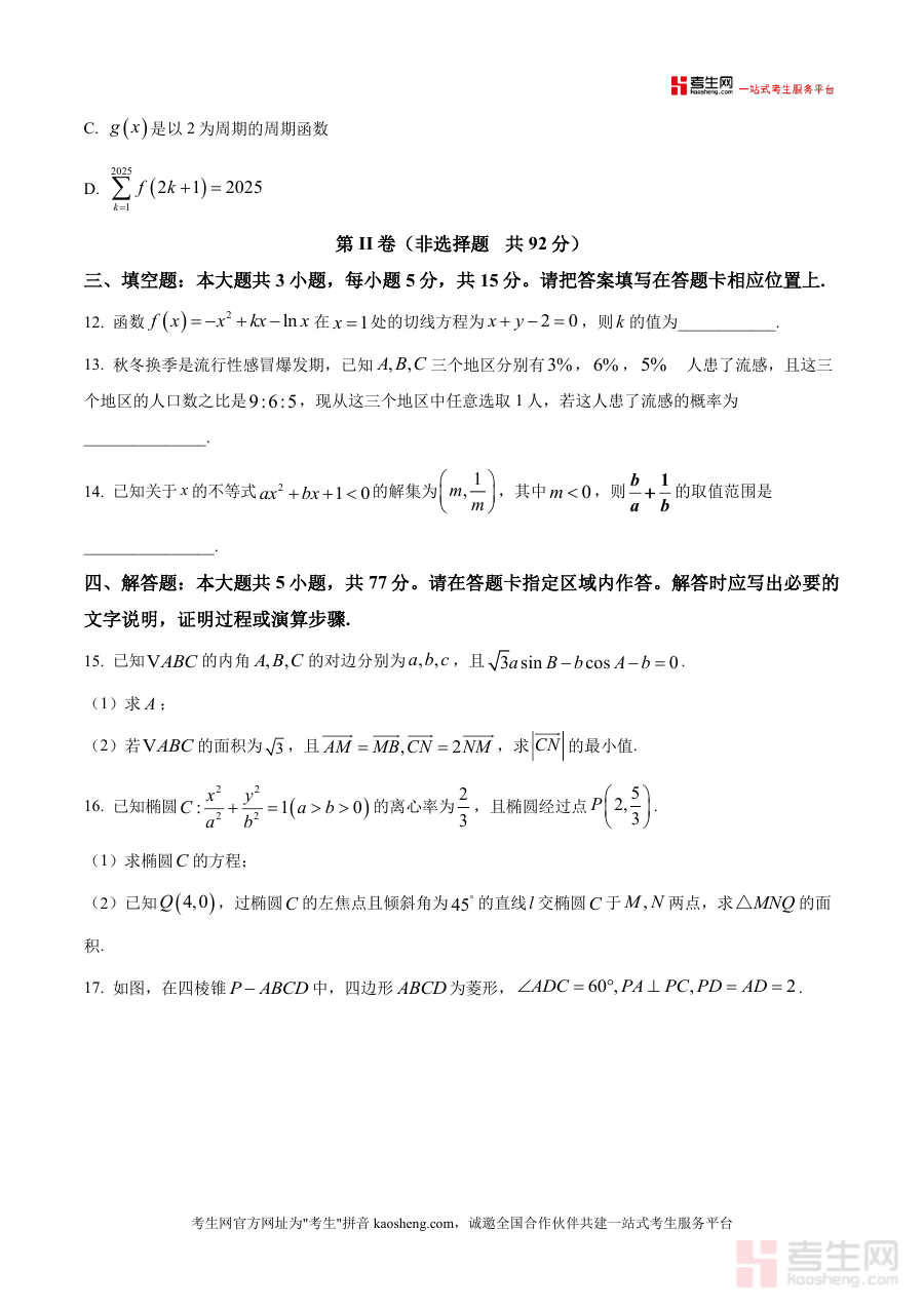 该资料核心用途为高三学生期中阶段自测评估与知识薄弱点诊断,使用场景涵盖课堂限时模拟训练、课后自主刷题巩固、模考前适应性练习等环节;用户价值体现在通过真实联考真题提升应试能力,熟悉区域命题风格与难度梯度,明确备考优先级;备考优势在于其原卷版的完整性与权威性——严格还原联考考试时长(120分钟)与分值分布(150分),帮助学生提前适应联考答题节奏与时间分配策略,助力高效复习规划落地。