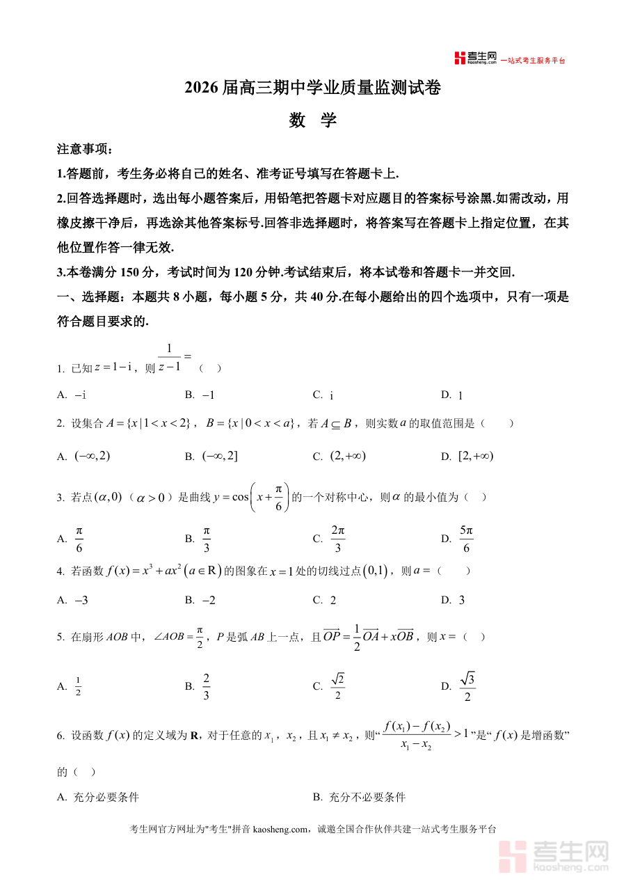 本资料适用于江苏省南通市及周边地区高三学生、高中数学教师及高考备考辅导人员。作为区域期中质量监测的原卷资源,它具有不可替代性——既贴合本地教学实际,又能为学生提供真实的考试场景体验;其长期价值在于帮助学生构建系统的知识框架,为后续一轮、二轮复习明确方向,是高三数学备考阶段不可或缺的优质资料。