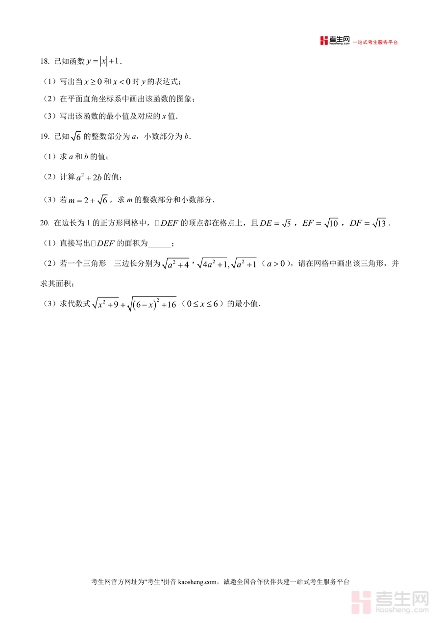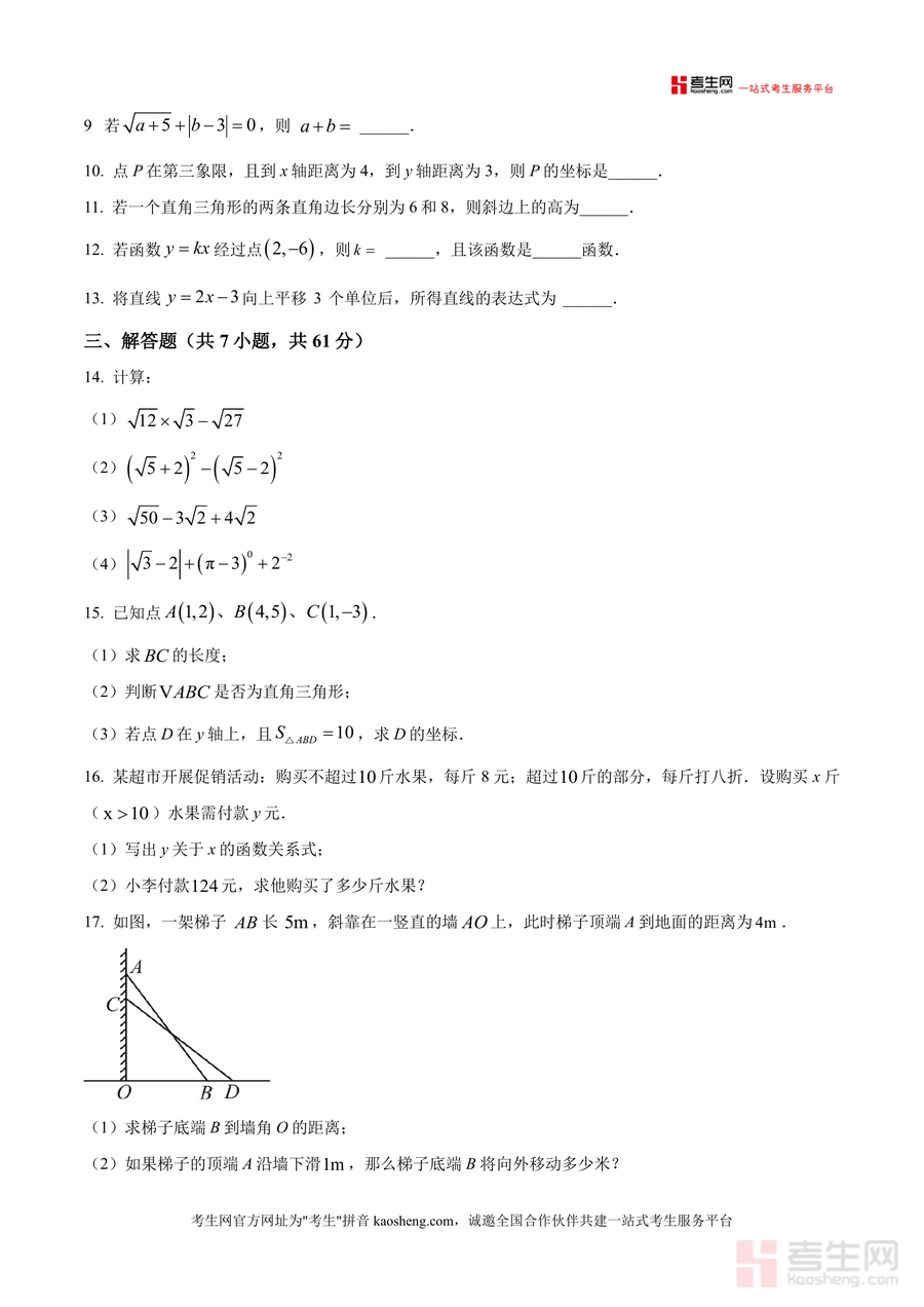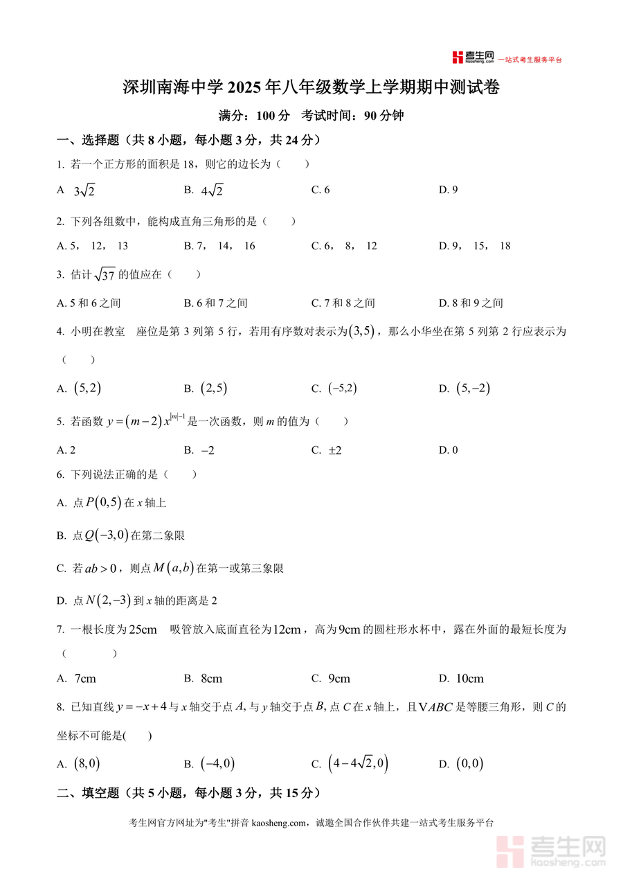 《精品解析:广东省深圳市南山实验教育集团南海中学2025-2026学年上学期八年级数学期中测试卷(原卷版).docx》是一份针对深圳南山实验教育集团南海中学八年级学生量身打造的期中备考核心资料,严格贴合该校当学期数学教学进度与考核要求。试卷结构完整规范,包含选择题(8小题共24分)、填空题(5小题共15分)及解答题(7小题共61分)三大模块,覆盖平方根运算、勾股定理应用、一次函数表达式与图象、平面直角坐标系等核心知识点,题型设置与分值分布完全匹配该校期中实际考试标准,为学生提供真实的校考题型参考与训练素材。