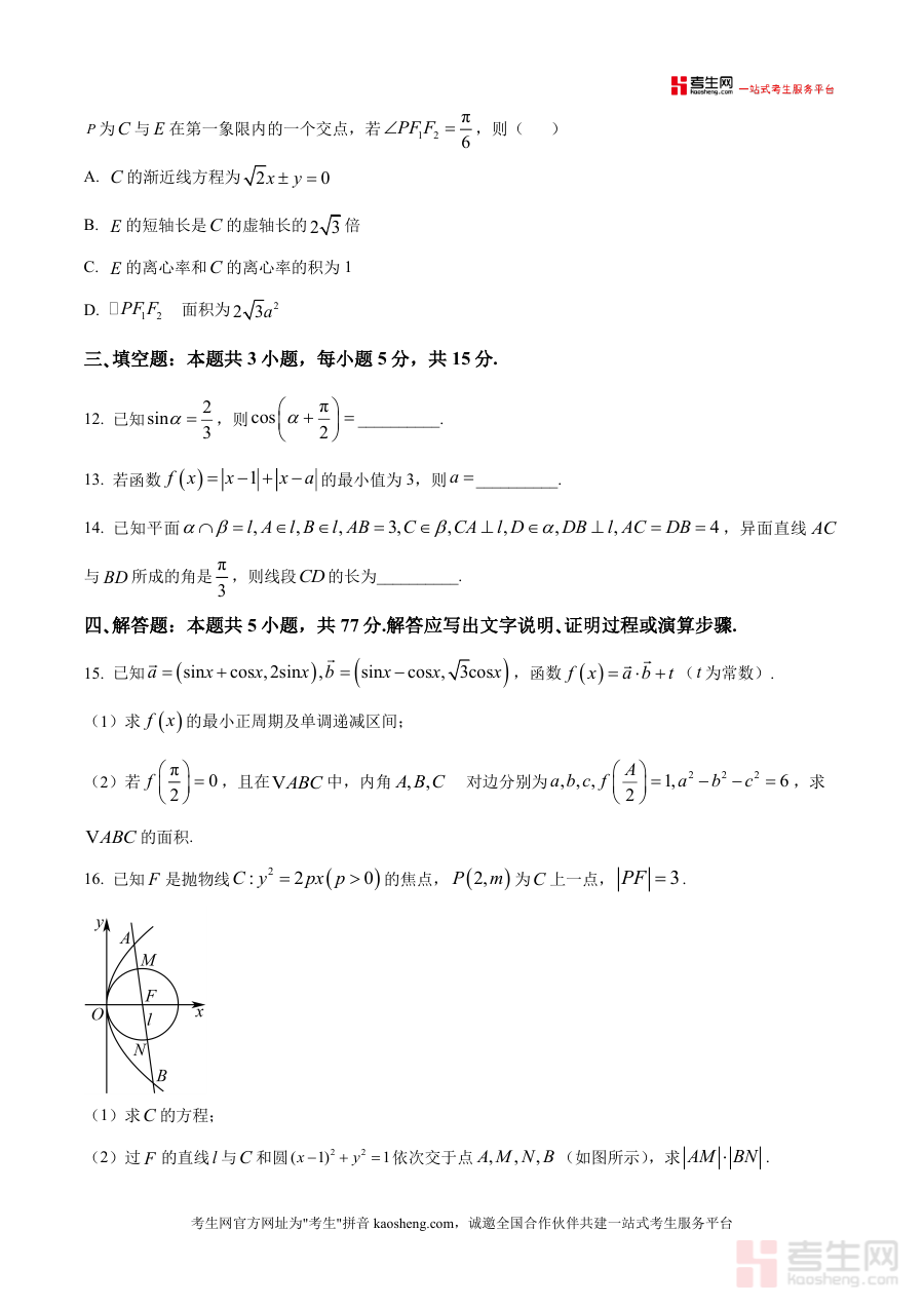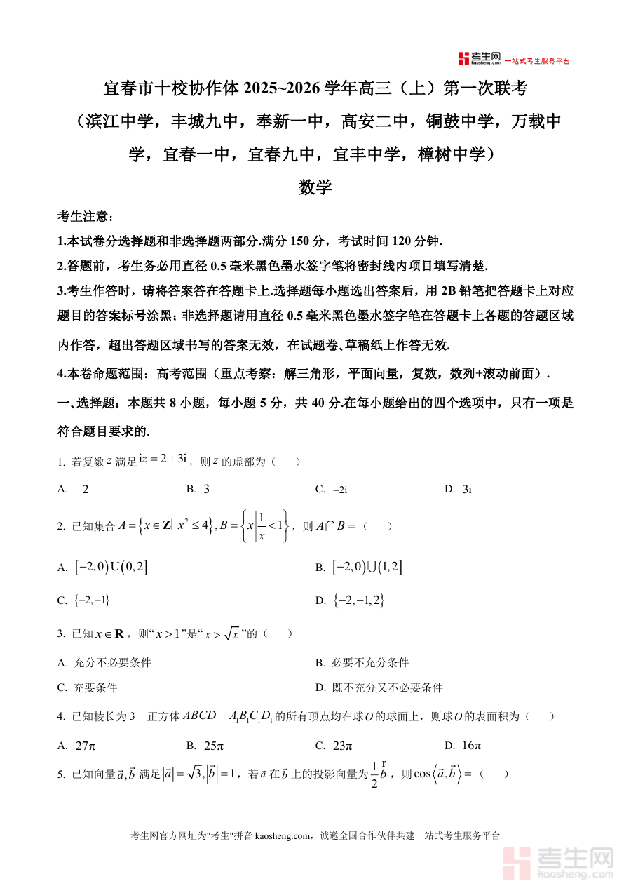 本试题适用于宜春本地及周边地区的高三学生、高中数学教师及高考备考辅导机构。作为高三上学期首次联考真题,它是一轮复习阶段不可或缺的实战资料;其联合命题的专业性与区域适配性使其具有不可替代性;长期来看,该试题能帮助学生巩固核心知识点、构建完整知识体系,并通过真题训练强化解题思维,为后续二轮专题突破与三轮模拟冲刺奠定坚实基础。