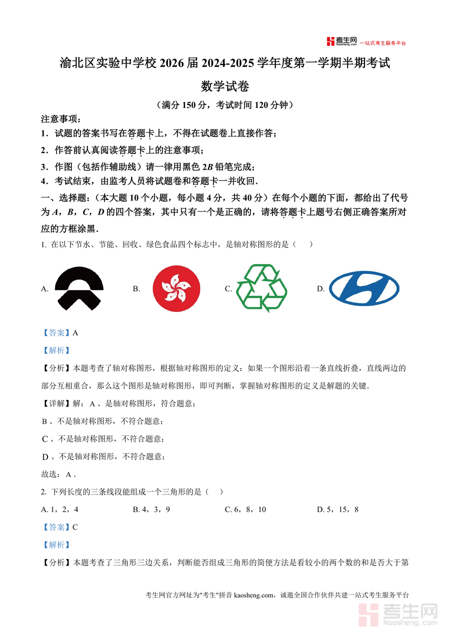 《精品解析:重庆市渝北区实验中学校2024一2025学年上学期半期考试八年级数学试卷(解析版).docx》是一份针对八年级数学阶段性测评需求打造高质量备考资料,聚焦轴对称图形判定、全等三角形性质与判定、等腰三角形特性及线段垂直平分线应用等核心知识点,覆盖选择、填空及解答全题型。其特色亮点在于逐题提供精准考点定位、详细解题思路推导及易错点警示,同时融入规范答题步骤示例,助力使用者全面掌握考题背后知识逻辑。