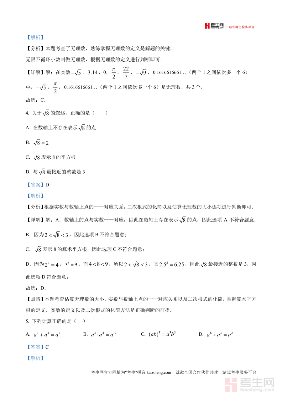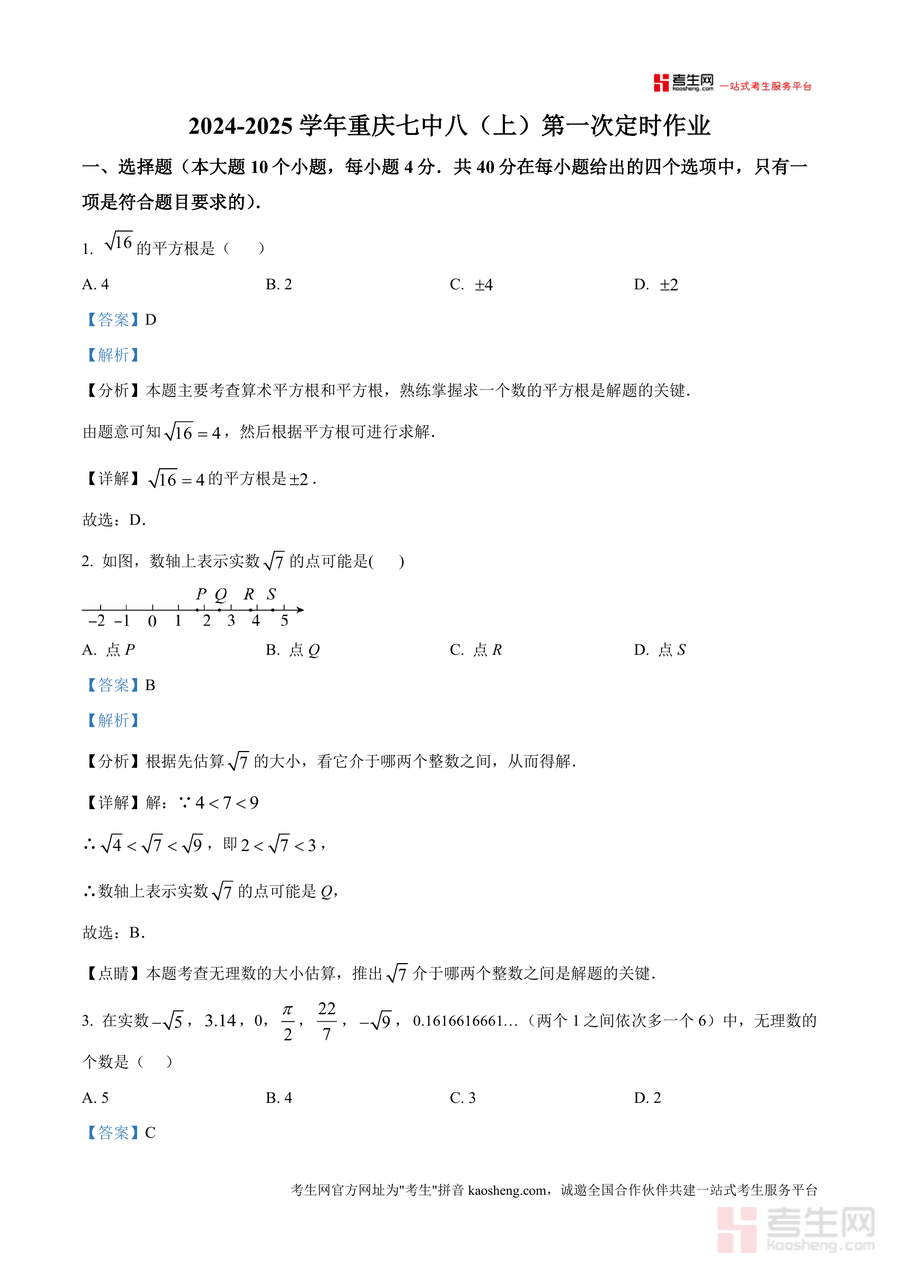 《精品解析:重庆市第七中学校 2024-2025学年八年级数学上学期10月月考试题(解析版).docx》是一份针对该校八年级上学期数学阶段性检测设计专业备考资料,覆盖全卷10道选择题、8道填空题及9道解答题,涵盖平方根运算、无理数识别、全等三角形判定、整式乘除等核心知识点。其特色亮点在于每道题均配备考点定位、分步解题思路及易错点警示,如对无理数估算题明确"介于相邻整数之间"逻辑,对全等三角形证明题标注ASA/SAS判定依据,对规律探究题总结通项公式推导方法,帮助学生精准把握考点本质与解题技巧。