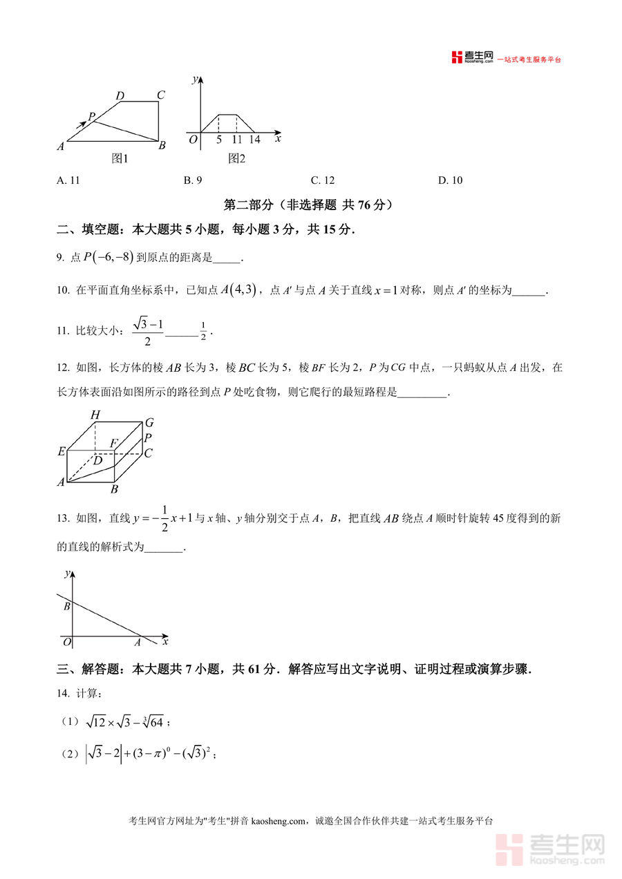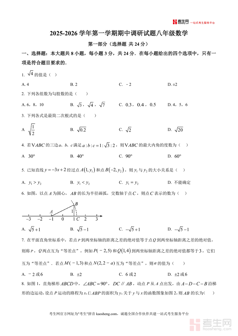 《精品解析:广东省深圳市宝安区西乡十几校2025-2026学年八年级上学期期中调研数学试题(原卷版).docx》是一份聚焦深圳宝安区西乡片区十余所学校联合命题的八年级数学期中调研原卷资料,核心定位为区域同步教学质量检测工具与学生期中备考参考素材。文件涵盖第一部分选择题(8小题共24分)、第二部分非选择题(含5道填空题15分及7道解答题61分)三大模块;内容覆盖二次根式化简与运算、勾股定理应用、一次函数图像与性质、平面直角坐标系对称变换等八年级上册核心知识点;特色亮点在于严格遵循深圳本地教学大纲要求,并融入区域教研共识,题型设置贴合真实考试场景,能有效反映片区教学水平与学生知识掌握情况。