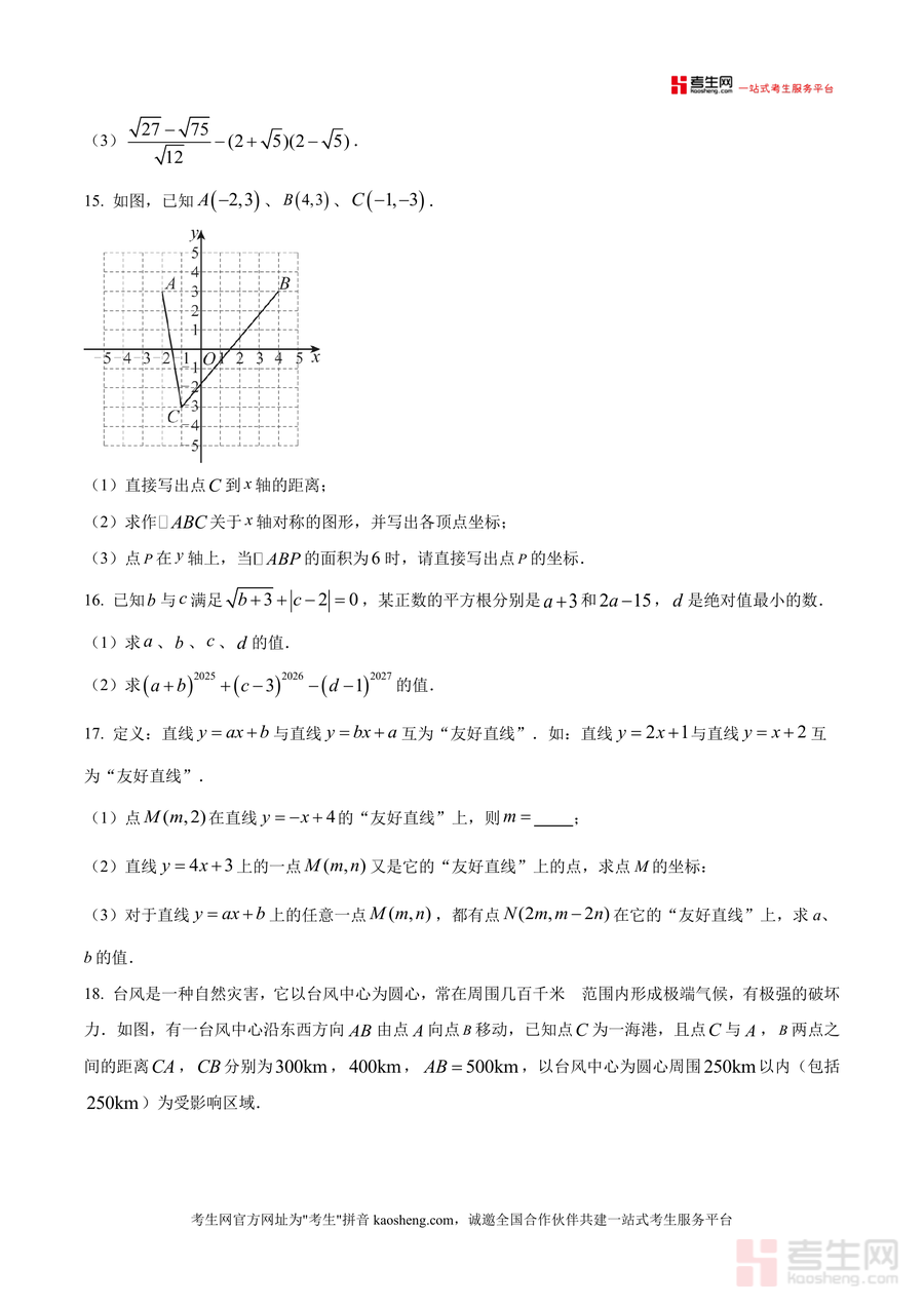 该资料核心用途为辅助学生进行期中备考训练与教师开展教学质量评估。使用场景包括学生自主刷题巩固知识点、教师课堂模拟测试或作业布置、家长引导孩子针对性复习;用户价值体现在帮助学生熟悉期中试题结构与难度梯度,提升应试能力,同时让教师快速把握区域命题方向调整教学策略;备考优势在于原卷版完整保留了命题细节,如选择题中的"等差点"创新概念题、解答题中的台风影响计算与机器人运动函数图像题,能有效训练学生的知识迁移与综合应用能力。