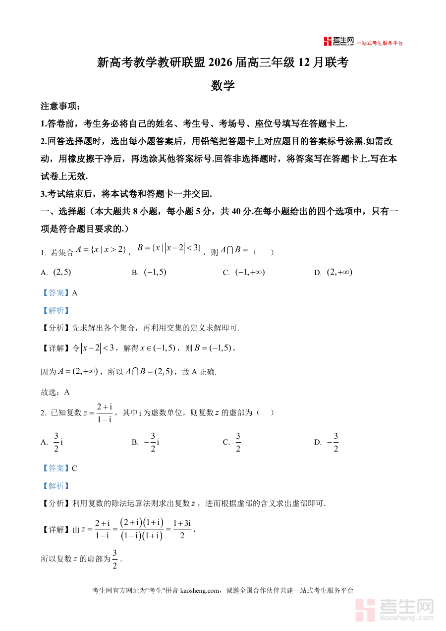 本资料适用于湖南省新高考地区高三学生(尤其是参与该联盟联考者)、高中数学教师及备考辅导从业者。作为湖南新高考重要模考权威解析,它不仅是考生查漏补缺关键工具,更是教师把握本地命题趋势、优化教学策略的参考依据;其不可替代性体现在对联盟命题规律的深度挖掘,长期价值则在于为后续二轮专题突破与三轮模拟训练提供数据支撑,助力使用者高效备考。
