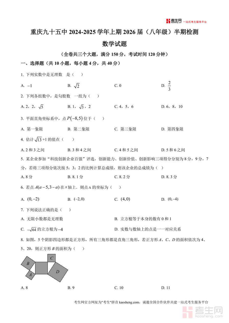 《精品解析:重庆市第九十五初级中学校2024-2025学年八年级上学期半期检测数学试题(原卷版).docx》是一份聚焦重庆九十五中八年级上学期数学教学重点的权威半期检测原卷资料。该资料严格依据学校教学进度与初中数学课标要求编制,涵盖无理数概念与运算、勾股定理及其应用、平面直角坐标系坐标定位与变换、统计方差计算等核心知识点;题型设置为选择题(10小题,40分)、填空题(8小题,32分)、解答题(8小题,78分)三大类,全面覆盖半期教学内容,且题目难度梯度合理,能真实反映学生知识掌握程度与解题能力水平。
