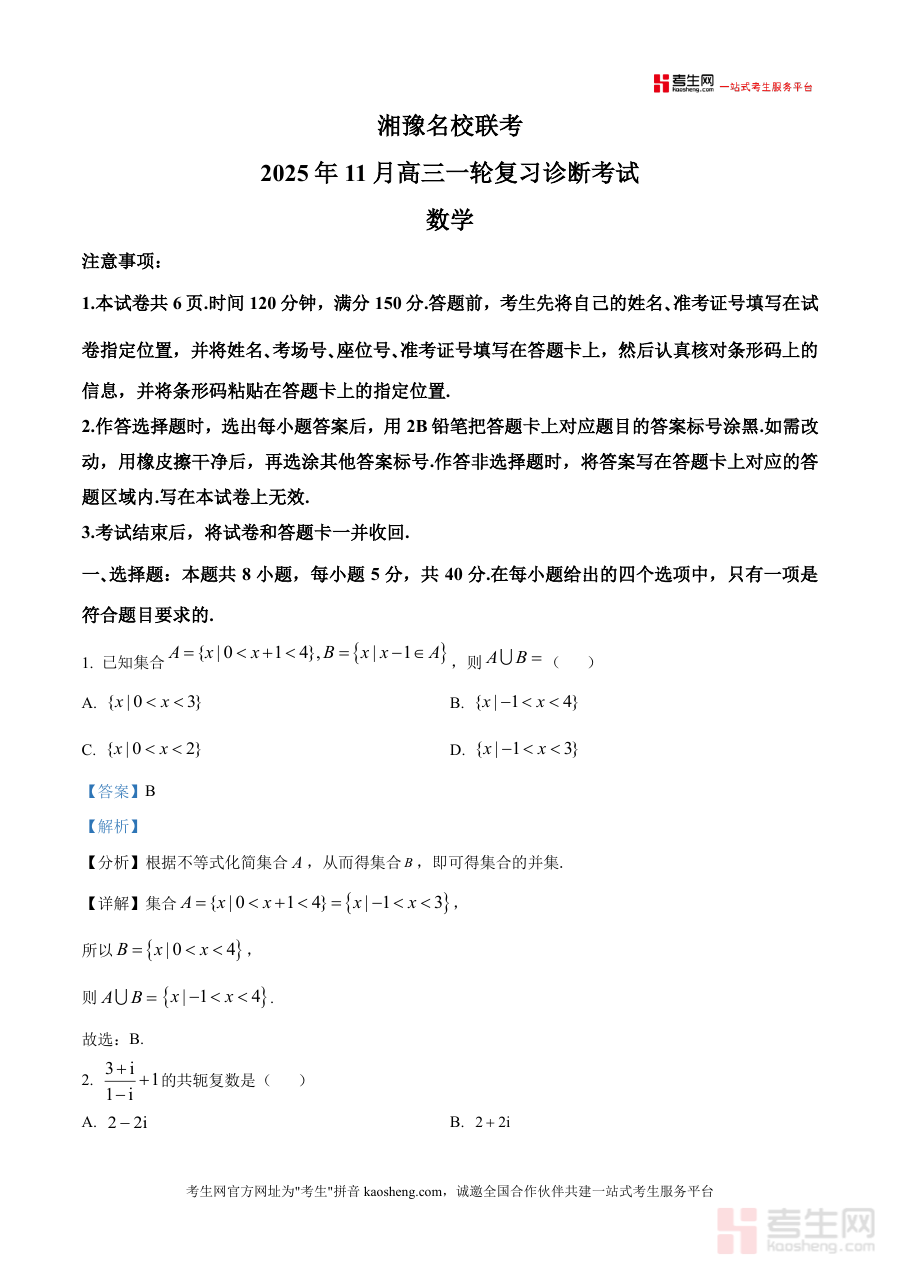 《精品解析:湘豫名校联考2025-2026学年高三上学期11月一轮复习诊断考试数学试题(解析版).docx》是一份聚焦高三数学一轮复习关键节点的权威备考资料。该资料依托湘豫两地名校联考真题,覆盖集合运算、复数性质、函数极值与导数应用、数列递推关系、向量数量积、三角函数恒等变换等高考核心考点,每道试题均配备详实解析内容,包含题目分析、步骤详解及思路点睛板块——如选择题中通过指对互化解决行驶里程问题、填空题中利用基本不等式求最值等案例,为学生提供系统真题解析参考。