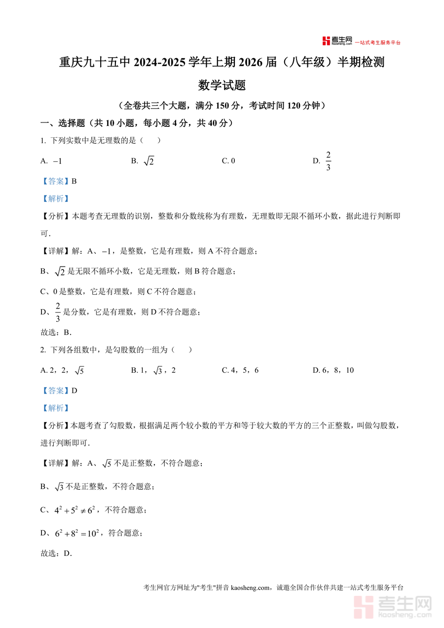 《精品解析:重庆市第九十五初级中学校2024-2025学年八年级上学期半期检测数学试题(解析版).docx》是一份针对该校八年级学生数学半期备考需求打造的专业真题解析资料,涵盖全卷三个大题(选择题10道、填空题8道、解答题8道)共26道题目的完整解析。每份题目均包含考点分析(如无理数识别、勾股数判断、平面直角坐标系象限特征等)、详细解题步骤及易错点提示,特色在于结合该校命题规律,融入实用解题技巧(如长方体表面最短路径展开法、折叠问题勾股定理应用),帮助学生精准把握考点本质与命题方向。