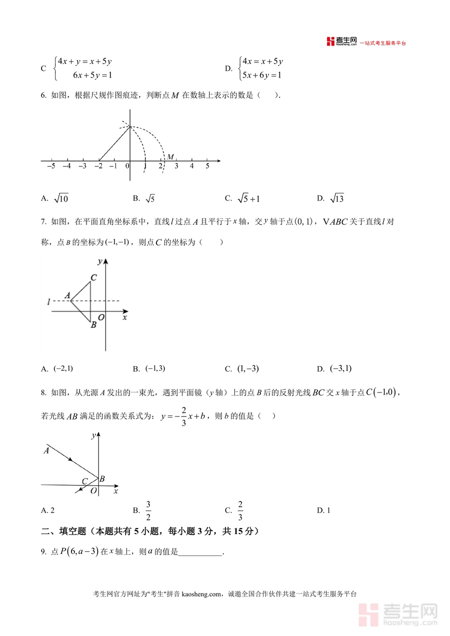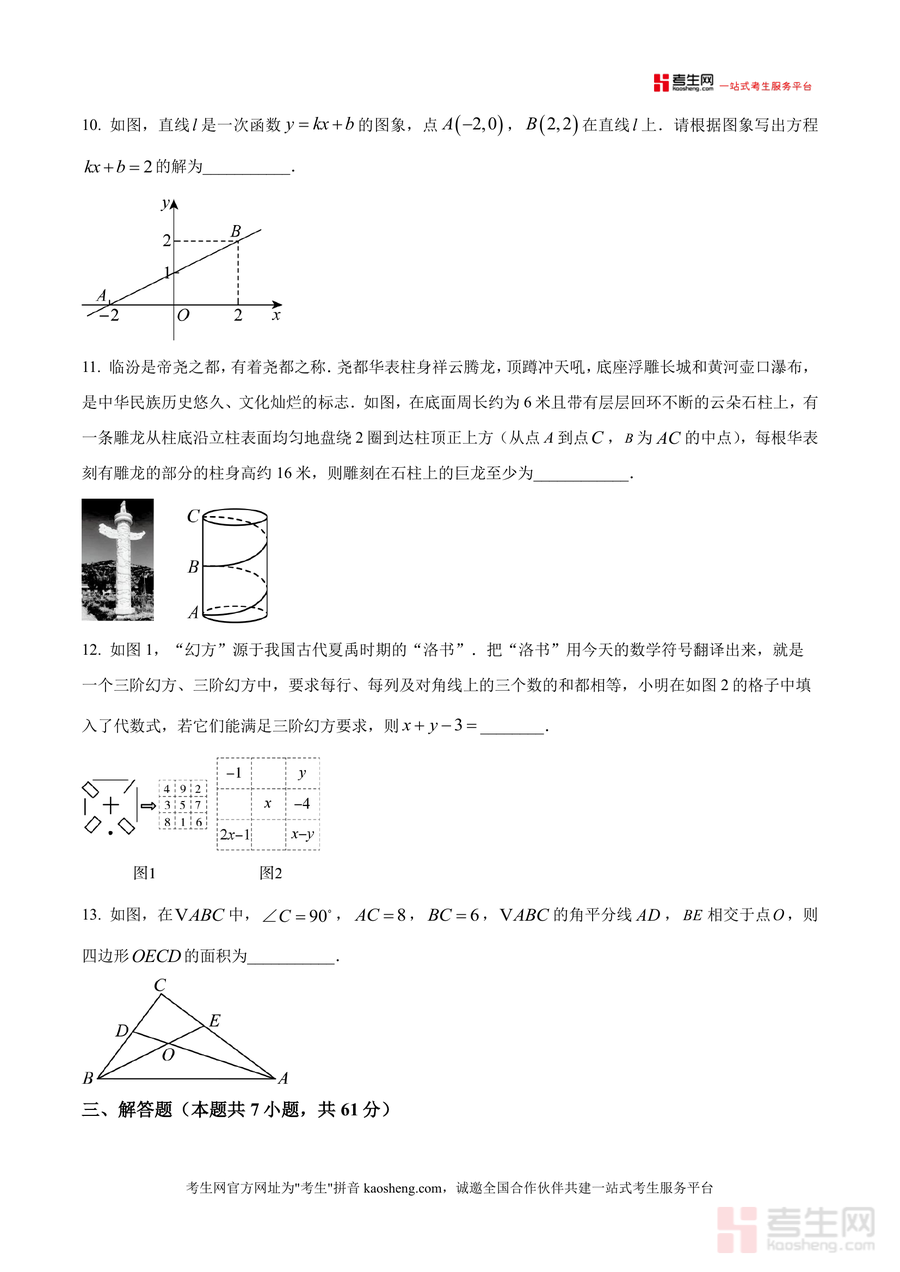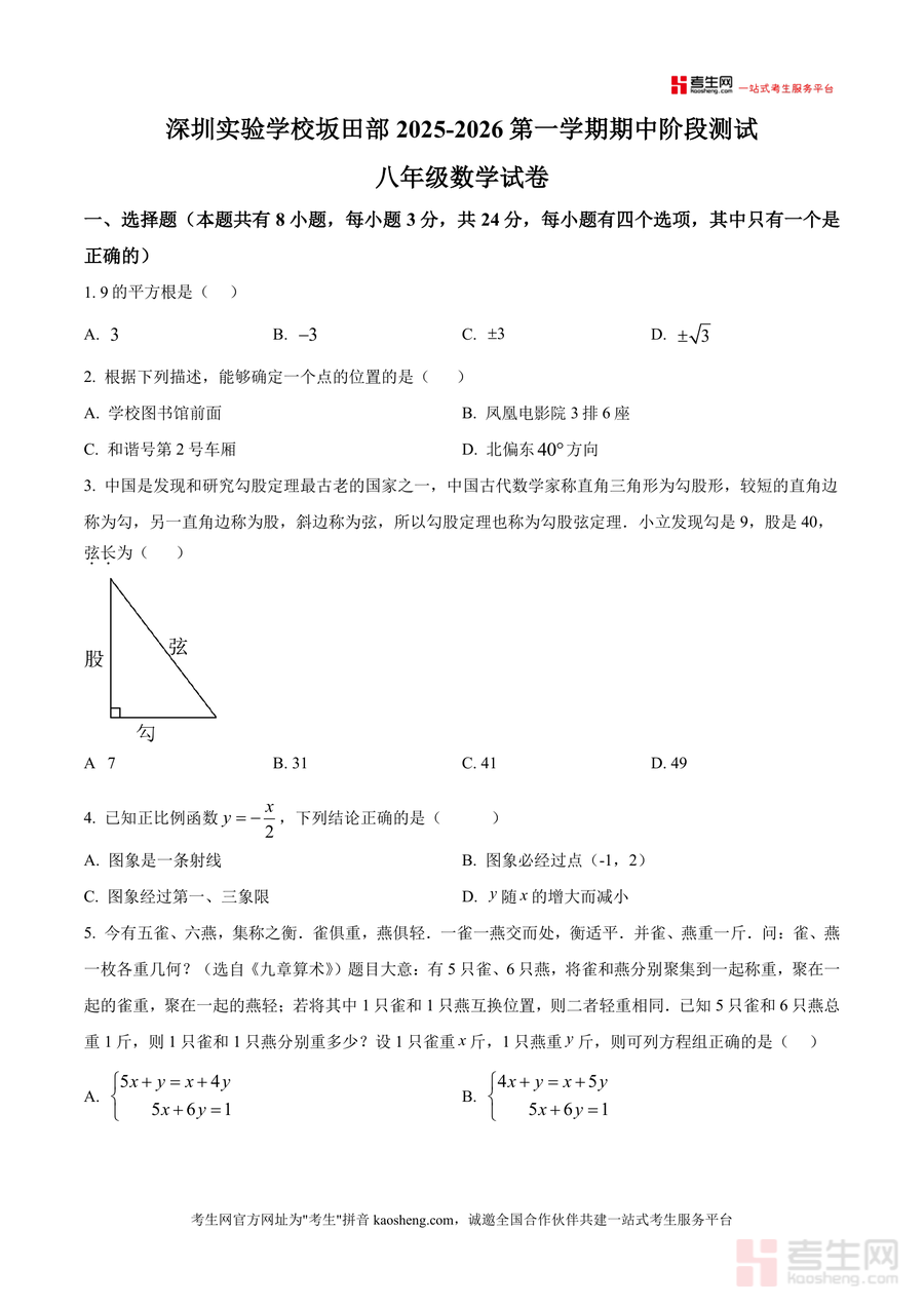 《精品解析:广东省深圳市深圳实验学校坂田部2025-2026学年上学期八年级期中考试数学试卷(原卷版).docx》是一份聚焦八年级上学期数学核心知识与能力测评需求的权威备考资料。该试卷严格遵循深圳实验学校坂田部教学大纲,涵盖平方根运算、勾股定理应用、一次函数图像与性质、二元一次方程组求解、几何变换与坐标对称等关键知识点;题型设置包含选择题(8道)、填空题(5道)、解答题(7道)三大模块,其中解答题融入垃圾分类费用对比、三星堆研学租车方案等实际应用场景及几何探究类压轴题,全面考察学生知识掌握程度与综合解题能力。