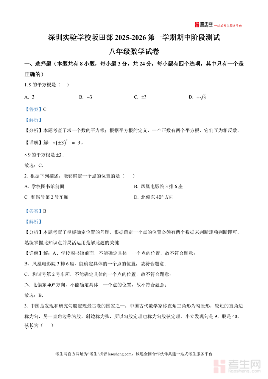 《精品解析:广东省深圳市深圳实验学校坂田部2025-2026学年上学期八年级期中考试数学试卷(解析版).docx》是一份聚焦深圳实验学校坂田部八年级期中数学核心考点,融合真题训练与深度解析专业备考资料。该资料完整呈现该校期中数学试卷全题型内容,覆盖平方根计算、坐标确定位置、勾股定理应用等八年级上册核心知识点;每道题均配有详细考点分析、规范解答步骤及易错提示,如勾股定理最短路径问题中,解析明确圆柱体侧面展开转化直角三角形的解题思路,助力学生理解本质。