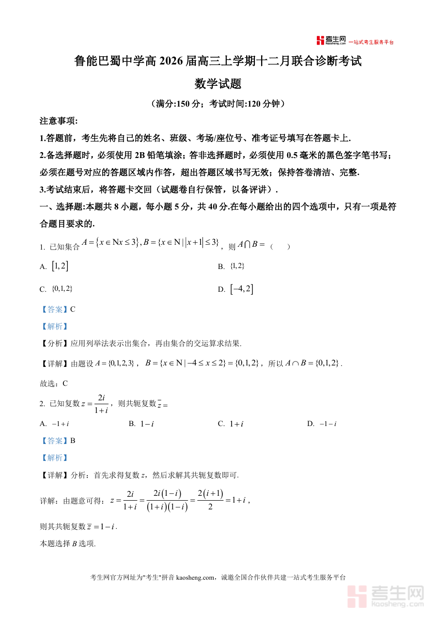 《精品解析:重庆市鲁能巴蜀中学校2026届高三上学期12月联合诊断考试数学试题(解析版)》是一份聚焦高三一轮复习关键节点、贴合重庆本地高考数学命题趋势高质量备考资料。该资料包含完整试题及逐题深度解析,覆盖集合与逻辑、复数、立体几何、向量、三角函数等核心考点;解析部分通过“考点分析—步骤详解—易错点睛”三层结构呈现:如集合题明确交运算规则、圆锥体积题拆解侧面展开图与底面半径关联、函数零点题结合图像法与导数工具分析,帮助学生精准把握解题逻辑与得分要点。