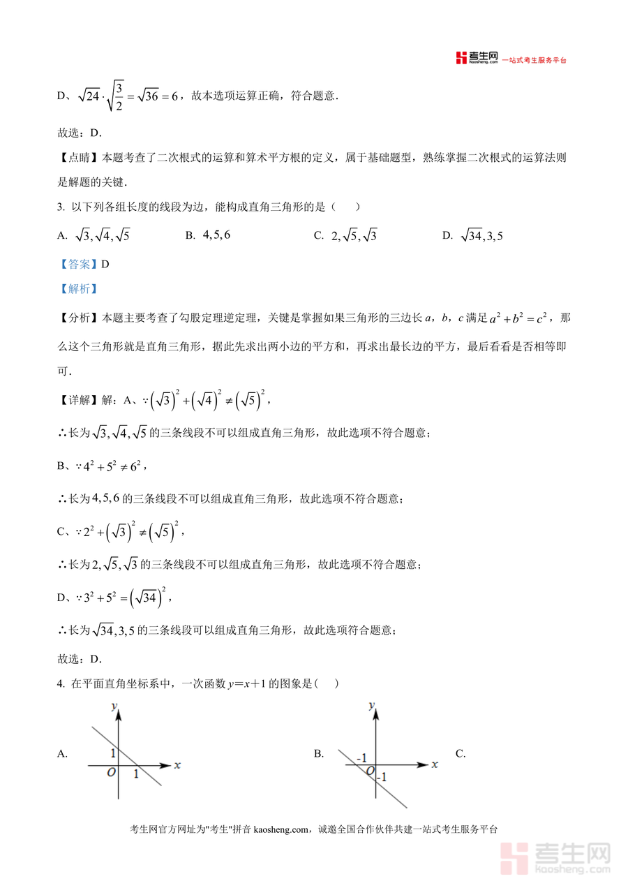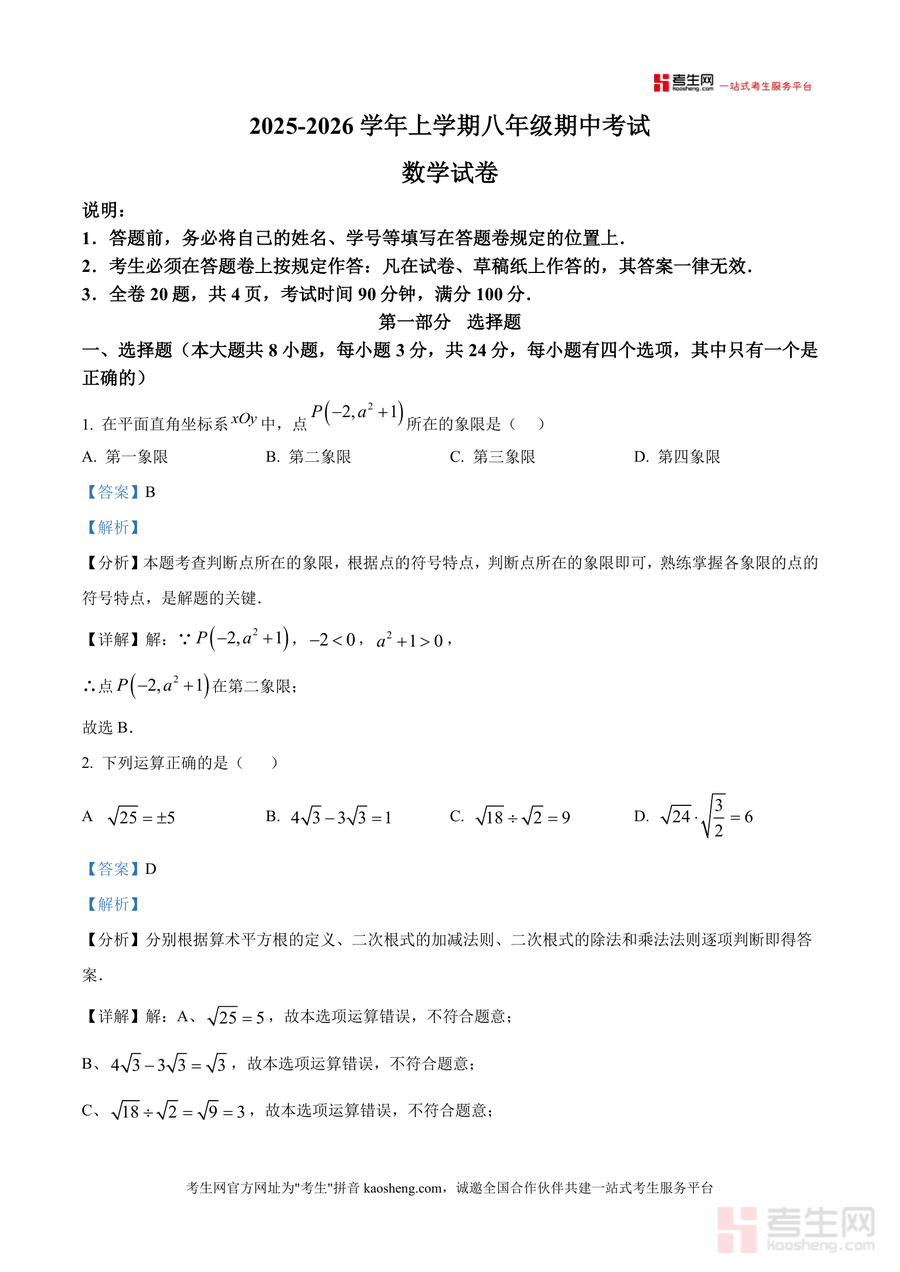 《精品解析:广东省深圳市福田区深大附中创新中学2025-2026学年八年级上学期期中考试数学试题(解析版).docx》是一份针对深大附中创新中学八年级上学期期中数学考试设计精准解析资料。文件包含全卷20道完整试题及逐题深度解析,覆盖平面直角坐标系、二次根式运算、勾股定理、一次函数等核心知识点。特色亮点在于每道题配备详细考点定位与易错点提示,如选择题中二次根式运算题对各选项错误原因逐一拆解并标注解题关键,解答题部分提供多种解题思路以拓展思维边界,真题解析过程严谨且贴合校考命题规律。