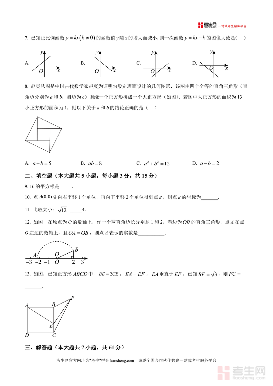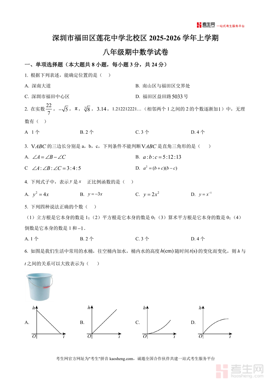 《精品解析:广东省深圳市福田区莲花中学北校区2025-2026学年上学期八年级期中数学试卷(原卷版).docx》是一份针对深圳福田区莲花中学北校区八年级上学期期中数学考试的精准化备考资料,涵盖单项选择(8小题)、填空题(5小题)、解答题(7小题)三大题型模块,全面覆盖实数运算、勾股定理应用、一次函数图像与性质、坐标几何、最短路径问题等核心知识点。该资料严格遵循该校教学进度与命题风格,题型设置贴合当地期中考试趋势,如赵爽弦图验证勾股定理、圆柱侧面蚂蚁爬行最短路径等特色题目,能有效还原真实考试场景,为备考提供可靠依据。