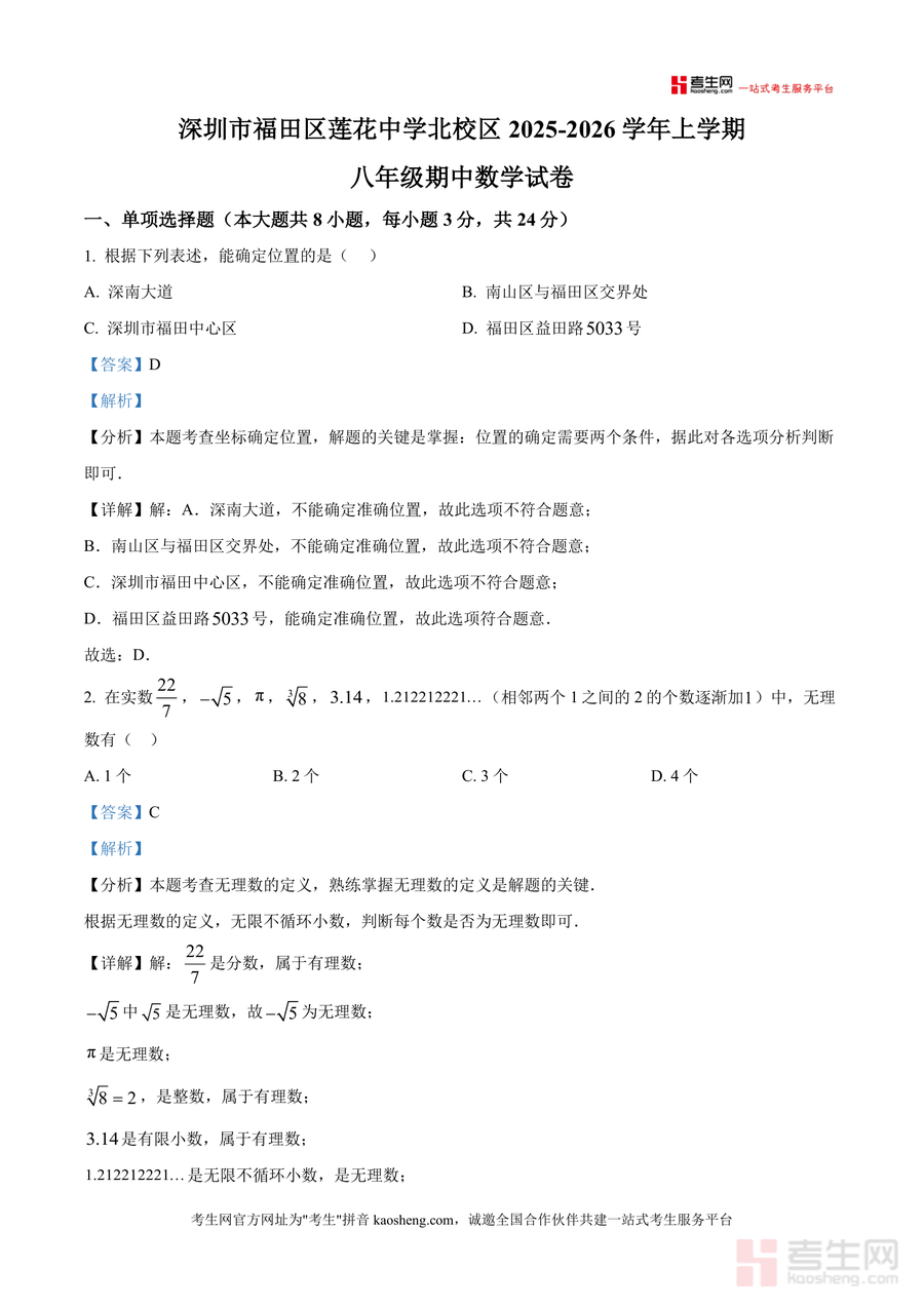 本资料适用于广东省深圳市福田区莲花中学北校区八年级学生、福田区同年级希望参考本地优质校真题学生及初中数学教师群体;其必要性在于直接对接该校期中命题方向,不可替代性体现在专属校区真题资源与本地化解析视角,长期价值则是帮助使用者构建系统化数学知识体系,为后续学习奠定坚实基础。