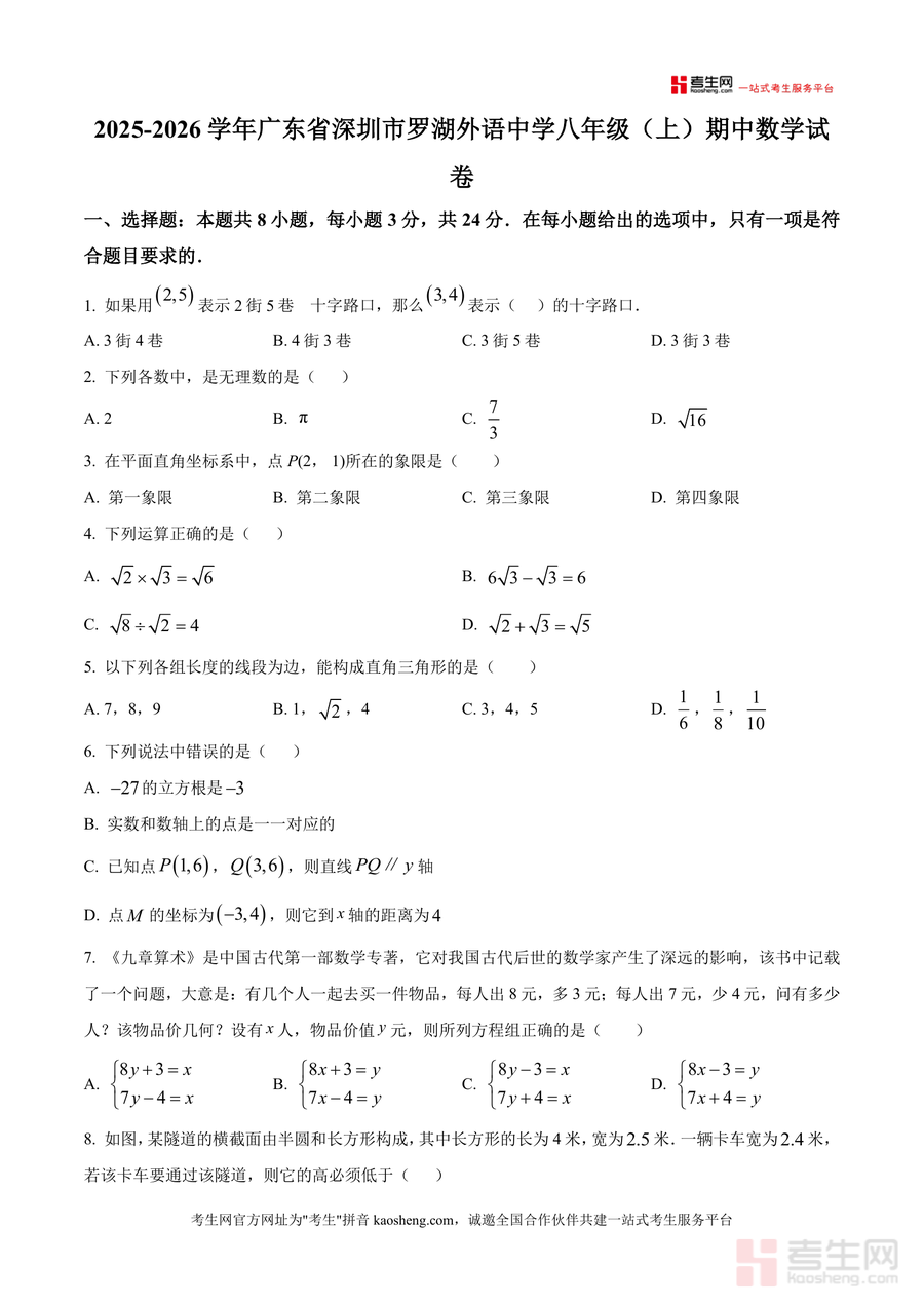 《精品解析:广东省深圳市罗湖外语中学2025-2026学年八年级上学期期中数学试卷(原卷版).docx》是一份针对深圳罗湖外语中学八年级学生设计的期中数学备考资料涵盖该学期核心知识点包括坐标系与点位置无理数识别勾股定理应用二元一次方程组求解等内容试卷结构规范完整包含选择题填空题及解答题三大题型题目设置贴合该校教学进度与难度要求能有效反映学生对基础知识和综合应用能力的掌握情况其特色在于结合本地教学实际与经典题型设计