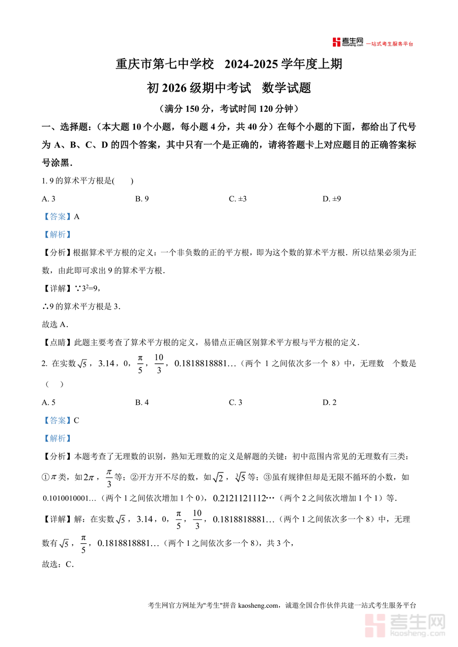 《精品解析:重庆市第七中学校2024-2025学年八年级上学期期中数学试题(解析版).docx》是一份针对重庆七中初二上学期期中数学考试设计的优质备考资料,整合该校最新期中真题与深度解析内容。资料覆盖选择题(如算术平方根、无理数识别)、填空题(因式分解、幂运算)及解答题(多项式运算、几何证明)三大题型,每个题目均配备详细思路分析、步骤拆解及易错点提示,例如无理数识别题明确初中三类无理数特征,全等三角形证明题强调角平分线性质与三线合一应用,助力学生精准把握考点。