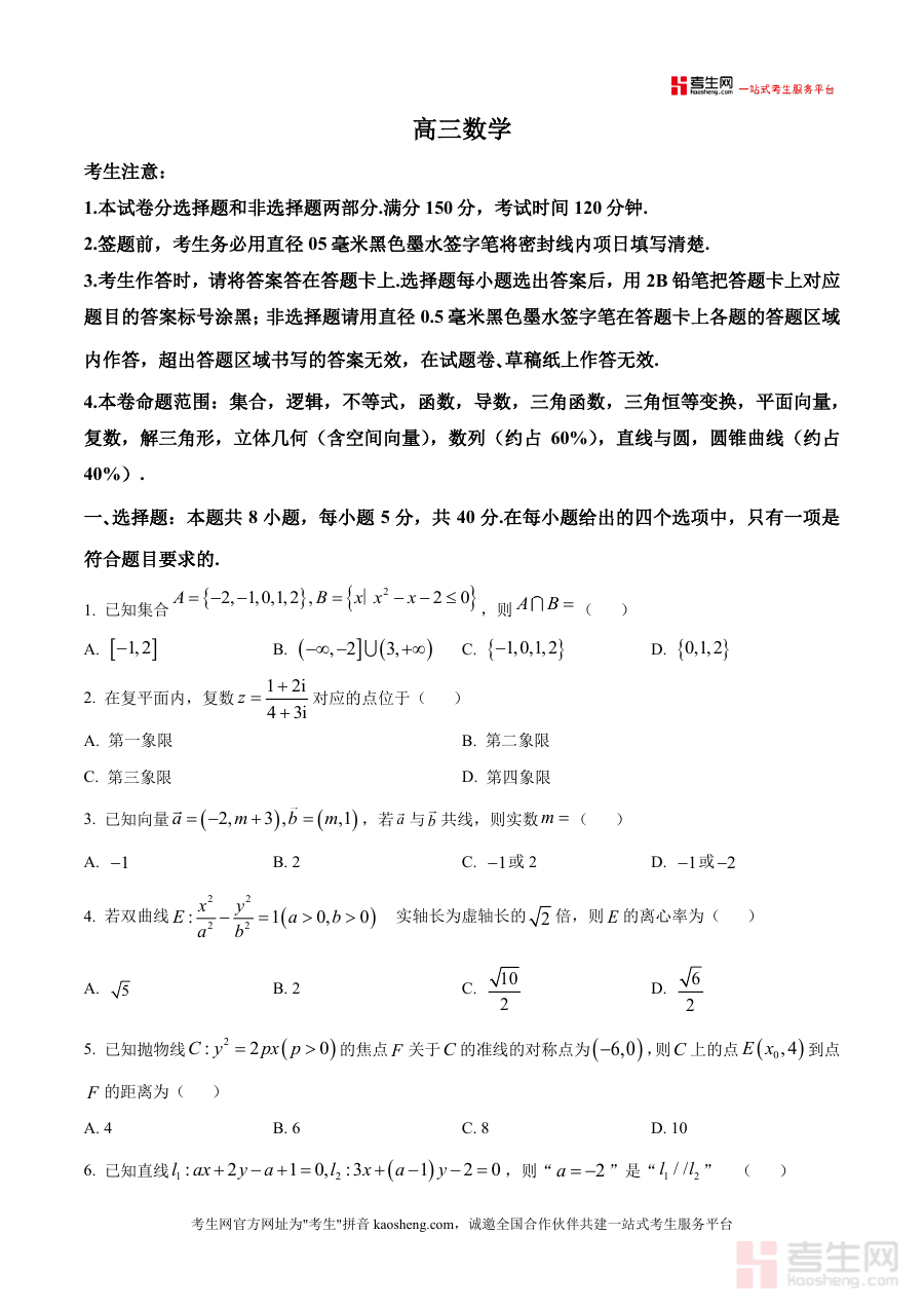 《精品解析:内蒙古自治区乌兰察布市九师联盟2026届高三模拟预测数学试题(原卷版).docx》是一份面向内蒙古乌兰察布市九师联盟体系内2026届高三学生的数学学科模拟预测原卷资料,核心内容覆盖集合与逻辑、不等式、函数与导数、三角函数及恒等变换、平面向量、复数、解三角形、立体几何、数列、直线与圆、圆锥曲线等高中数学全部核心模块;其中数列相关考点占比约60%,直线与圆及圆锥曲线考点占比约40%,题型包含8道单选题、3道多选题、3道填空题及5道解答题,完全匹配高考数学题型结构;其特色亮点在于依托九师联盟优质教研资源,紧密结合乌兰察布地区教学进度与高考命题趋势,试题难度梯度合理且兼顾基础巩固与能力拓展需求。