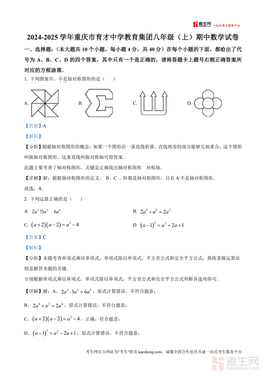 《精品解析:重庆市育才中学教育集团2024-2025学年八年级上学期期中数学试卷(解析版)docx》是一份针对重庆本地名校期中数学考试的高质量备考资料,包含完整试卷原题及每道题 的详细解析。内容覆盖八年级上学期核心知识点如轴对称图形判定、整式运算规律、三角形三边关系、全等三角形性质等考点,特色亮点在于每道题均配备考点分析、步骤详解及易错点睛——例如选择题中对轴对称图形概念进行延伸解读,解答题部分通过多种方法演示提升思维灵活性,填空题则注重基础公式 的应用梳理。