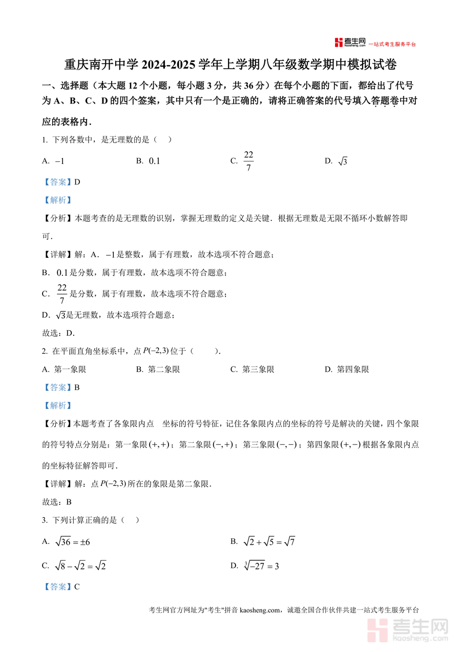 《精品解析:重庆南开中学2024-2025学年上学期八年级数学期中模拟试卷(解析版).docx》是一份聚焦重庆南开中学八年级数学期中备考核心需求真题解析类资料。内容涵盖完整模拟试卷及逐题深度解析,题型包括选择题(如无理数识别、平面直角坐标系象限判断)、填空题(二次根式意义、一次函数平移)等期中高频考点题型;特色亮点在于解析部分结合知识点溯源(如无理数定义、一次函数图象性质)与解题技巧提炼(如勾股定理应用于折叠问题),同时融入南开中学命题风格分析,帮助学生精准把握考点方向与命题规律。