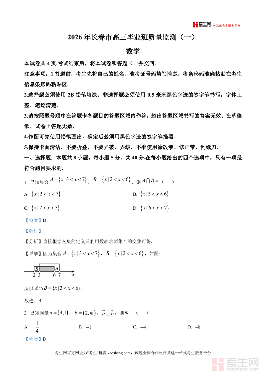 《精品解析:吉林省长春市2026届高三质量监测(一)数学试题(解析版)》是一份针对吉林省长春市2026届高三学生数学学科备考需求打造的专业真题解析资料。该资料包含完整试题文本与逐题深度解析两部分,试题覆盖集合、向量、复数、数列、三角函数、立体几何、圆锥曲线等高中数学核心模块,解析部分采用“分析-详解-总结”结构,不仅提供准确答案,还标注考点关联与易错点提示,如集合交集问题用数轴直观法呈现,复数运算明确虚部定义,立体几何题结合空间向量线性运算推导,帮助学生掌握解题方法与技巧。