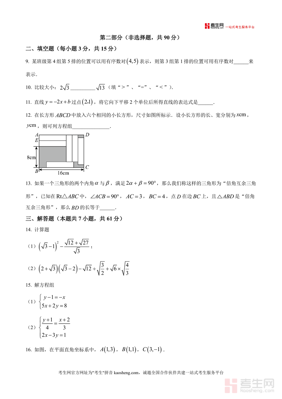 《精品解析:广东省深圳市龙华区龙华高级中学(集团)观澜校区2025-2026学年八年级上学期期中考试数学试题(原卷版).docx》是一份针对该校区八年级上学期期中考试的数学原卷备考资料。其主要内容涵盖第一部分选择题(8小题,涉及勾股数判断、平面直角坐标系坐标确定、代数运算正误辨析、函数图象识别等核心知识点),第二部分非选择题含5道填空题(有序数对表示、数值大小比较、直线平移表达式等)与7道解答题(计算、方程组求解、几何作图、函数应用及实际问题解决等题型)。特色亮点在于严格遵循校区考试说明规范(如答题要求、分值分布及答题卡使用规则),题型设置贴合当地期中命题趋势,能真实还原考场答题体验。