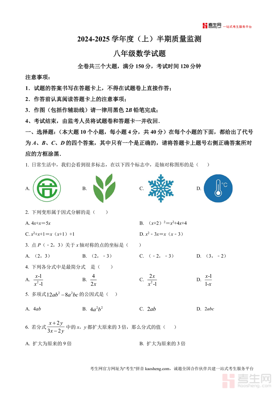 《精品解析:重庆市两江育才中学校2024-2025学年上学期八年级数学期中考试卷(原卷版)docx》是一份针对八年级数学期中阶段学习成果检测的高质量备考资料。该试卷严格遵循2024-2025学年上学期八年级数学教学大纲要求,涵盖轴对称图形识别、因式分解方法、分式化简与求值、等腰三角形性质及应用等核心知识点。试卷结构完整,包含选择题(10小题共40分)、填空题(8小题共32分)、解答题(8小题共78分)三大板块,并附有详细考试注意事项如答题规范、作图要求等,精准还原该校期中检测命题风格与难度梯度。