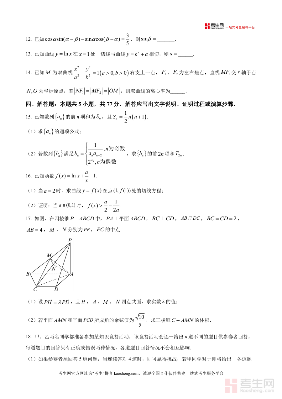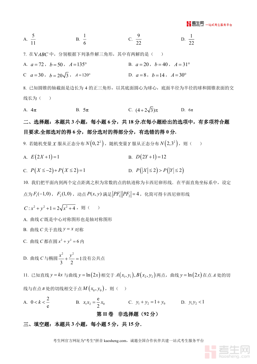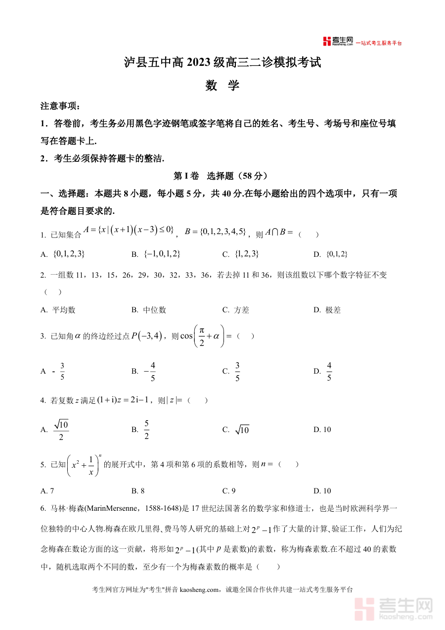 《精品解析:四川省泸县第五中学2026届高三上学期二诊模拟考试数学试题(原卷版).docx》是一份针对四川省泸县第五中学2026届高三学生设计的精准化数学模拟备考资料。该试题严格遵循四川二诊考试大纲要求构建题型体系:包含8道单选题(40分)、3道多选题(18分)、3道填空题(15分)及5道解答题(77分),覆盖集合运算、函数性质、数列通项、立体几何空间关系、解析几何曲线方程、概率统计应用等核心考点。其特色在于贴合四川地区高考及二诊命题趋势,融入经典题型与创新情境(如梅森素数概率题、卡西尼卵形线几何应用等),既考查基础知识掌握程度,又注重逻辑思维与应试技巧的综合提升。