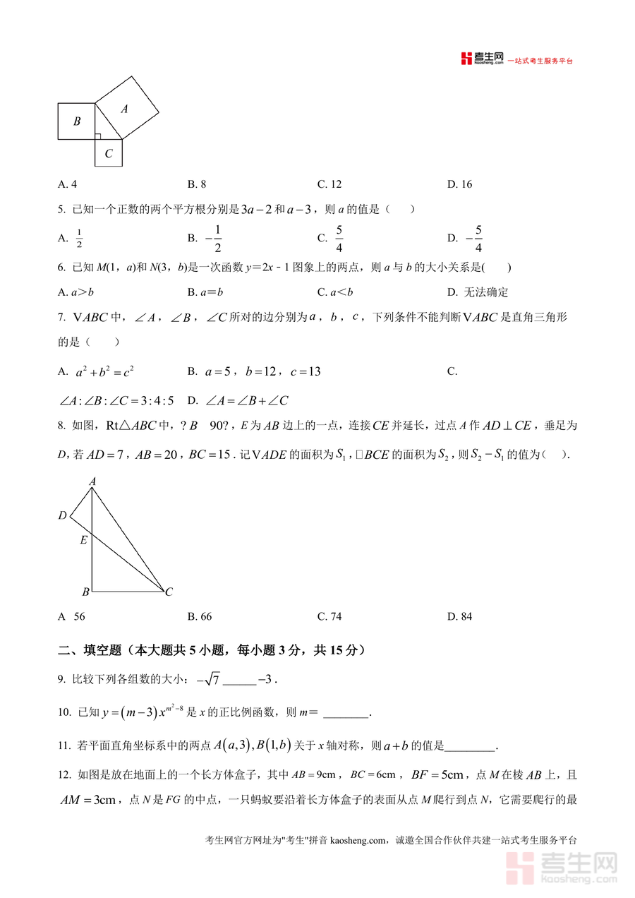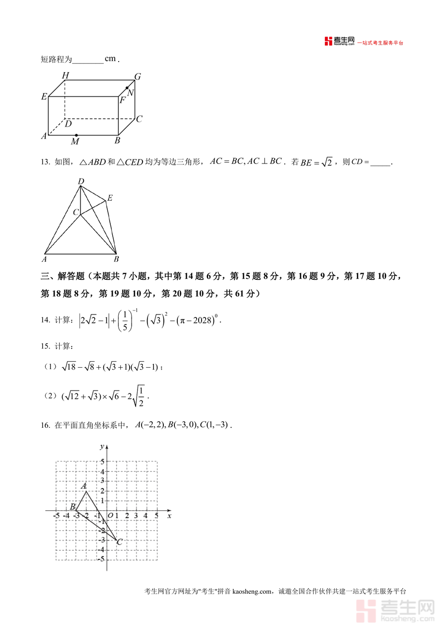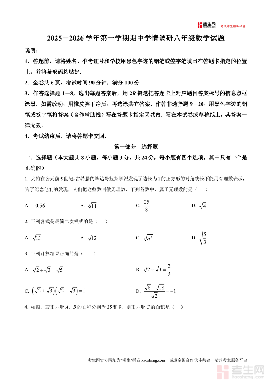 《精品解析:广东省深圳市龙岗区外国语学校2025-2026学年八年级上学期数学期中试题(原卷版).docx》是一份针对八年级学生期中数学复习的高质量备考资料。该资料严格遵循学校期中测试规范,涵盖选择题(8小题共24分)、填空题(5小题共15分)、解答题(7小题共61分)三大题型,全面覆盖无理数概念辨析、最简二次根式判断、勾股定理应用、一次函数性质分析等核心知识点,真实还原该校期中测试的题型结构与难度梯度。同时原卷版包含完整答题要求与考场规范指引,如信息填写、条形码粘贴及不同题型作答工具要求等,助力使用者沉浸式体验真实考试场景。