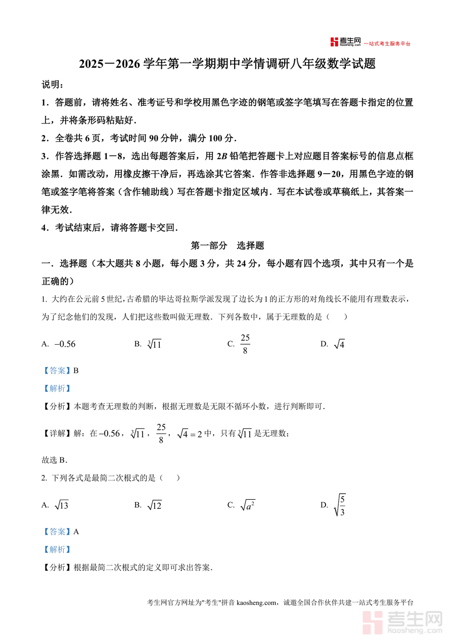 《精品解析:广东省深圳市龙岗区外国语学校2025-2026学年八年级上学期数学期中试题(解析版).docx》是一份针对该校八年级上册数学期中考试设计的专业备考资料,核心内容涵盖选择题、填空题、解答题三大题型完整真题及深度解析。资料不仅还原试题原貌,还对每道题进行考点定位、思路分析、步骤详解与易错点提示,覆盖无理数判断、最简二次根式识别、勾股定理应用、一次函数性质等核心知识点,突出真题解析与应试能力培养的结合特点。