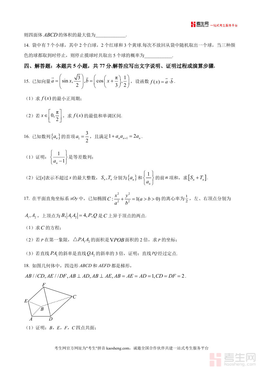 《精品解析:江苏省基地学校2026届高三上学期第一次大联考数学试卷(原卷版)》是一份针对江苏省2026届高三学生数学一轮复习阶段设计的权威真题类备考资料。该资料完整呈现了江苏省基地学校第一次大联考数学试卷的原貌,包含选择题(8道单选题+3道多选题)、填空题(3道)、解答题(5道)等全题型结构,覆盖函数性质、数列递推关系、立体几何空间位置判定、椭圆方程与直线定点问题、导数综合应用等核心考点。其特色在于依托江苏基地学校联考的命题权威性,题型设置严格遵循江苏高考数学命题趋势,题目梯度合理且具有典型性,能有效反映一轮复习初期学生需掌握的知识深度与能力要求。